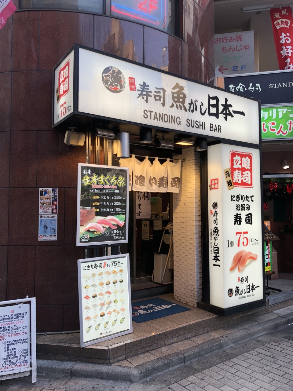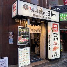 立ち食い寿司のお店です。回転ではありません。注文の度に板前さんが目の前で握ってくれます。利点は自分のペースで食べられること。たくさん食べても良いし、短時間で数個だけっていうのも全然ありです。一人で来ている人も多く、ちょこっとつまみない時に便利です。値段はお安め。ただ提供は二貫ずつなので、値段表記の倍になるので、そこは注意です。
