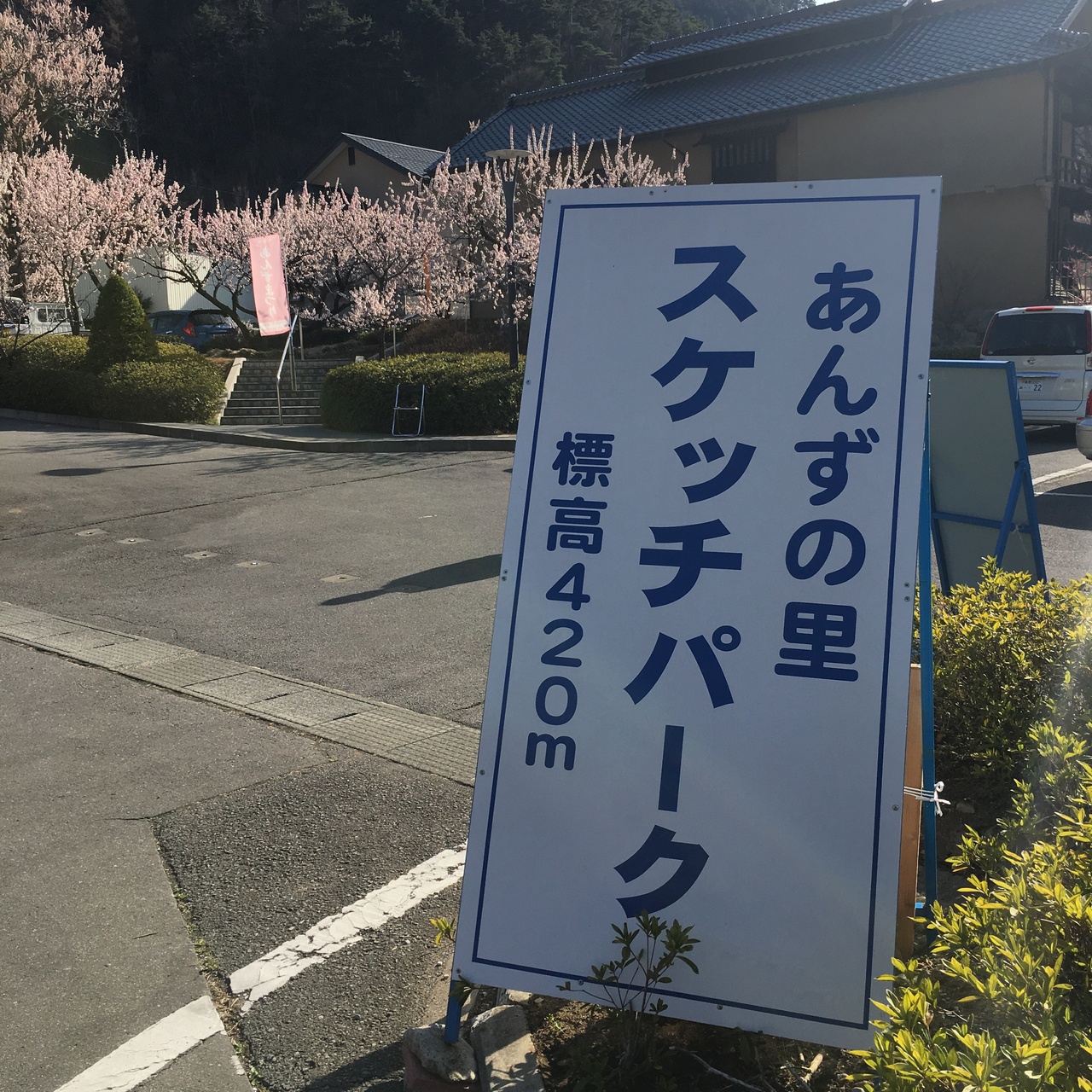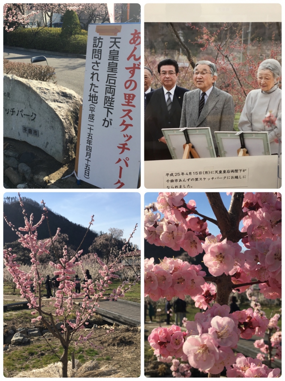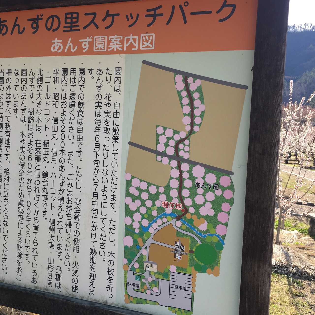 千曲・坂城シリーズ~あんずの里【スケッチパーク】案内所 天皇陛下記念歌碑 こちらのあんずは若い木が多いですね、ピンク色もありました、公園風で歩きやすいです。※ シートを敷いてピクニックもOKみたい、、あんずまつり期間中はお土産の販売も!