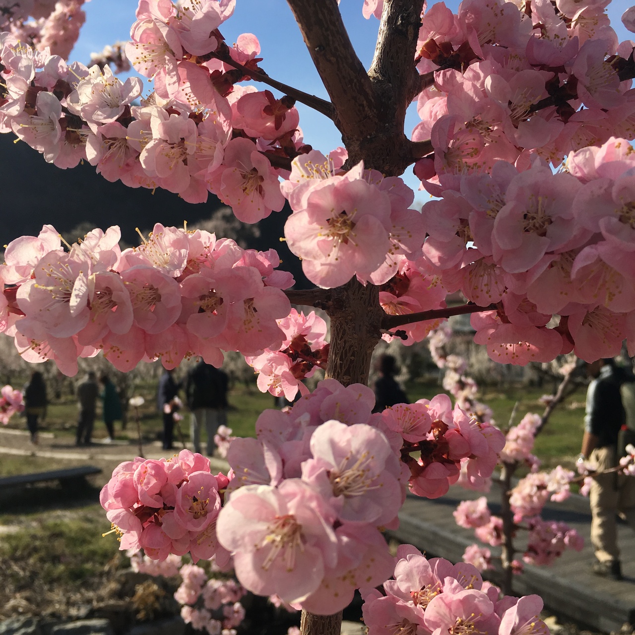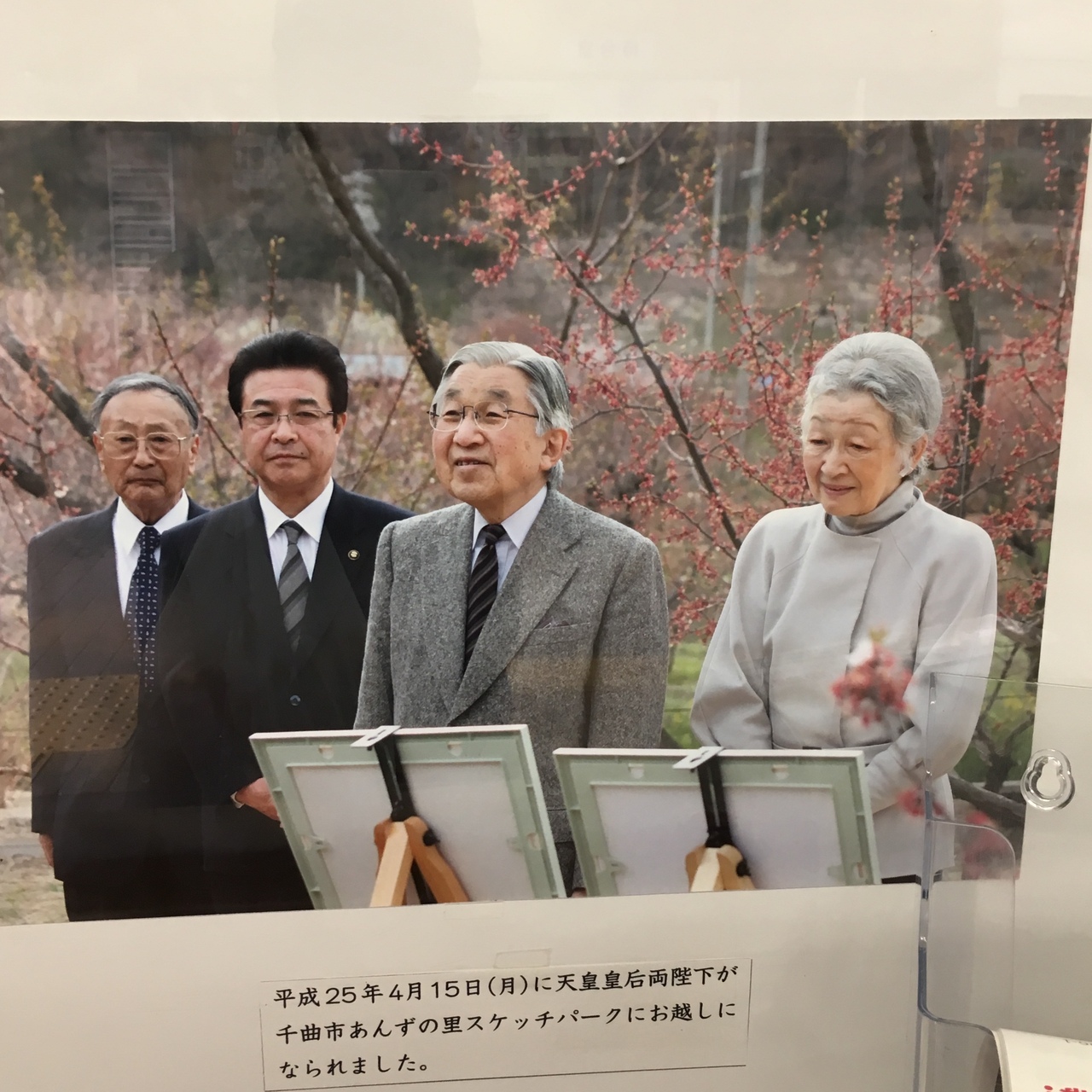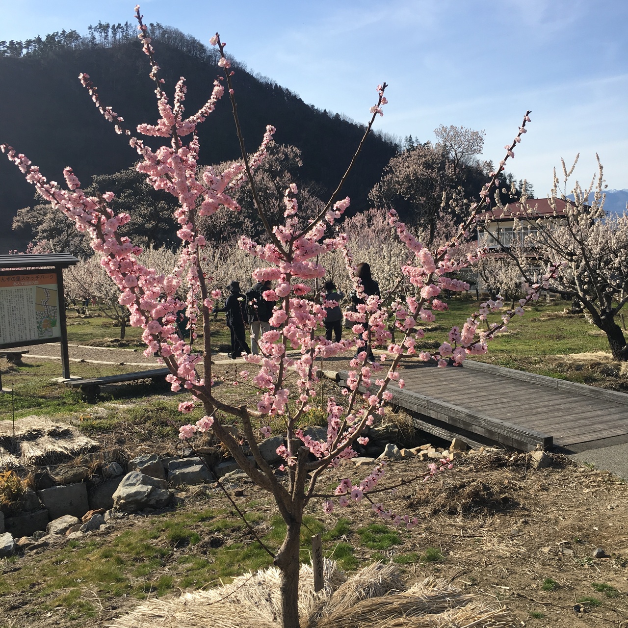 千曲・坂城シリーズ~あんずの里【スケッチパーク】案内所 天皇陛下記念歌碑 こちらのあんずは若い木が多いですね、ピンク色もありました、公園風で歩きやすいです。※ シートを敷いてピクニックもOKみたい、、あんずまつり期間中はお土産の販売も!