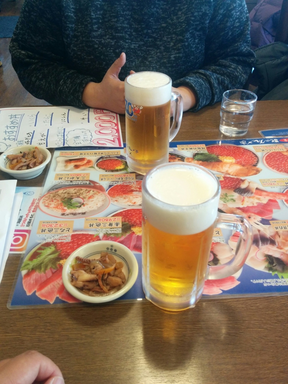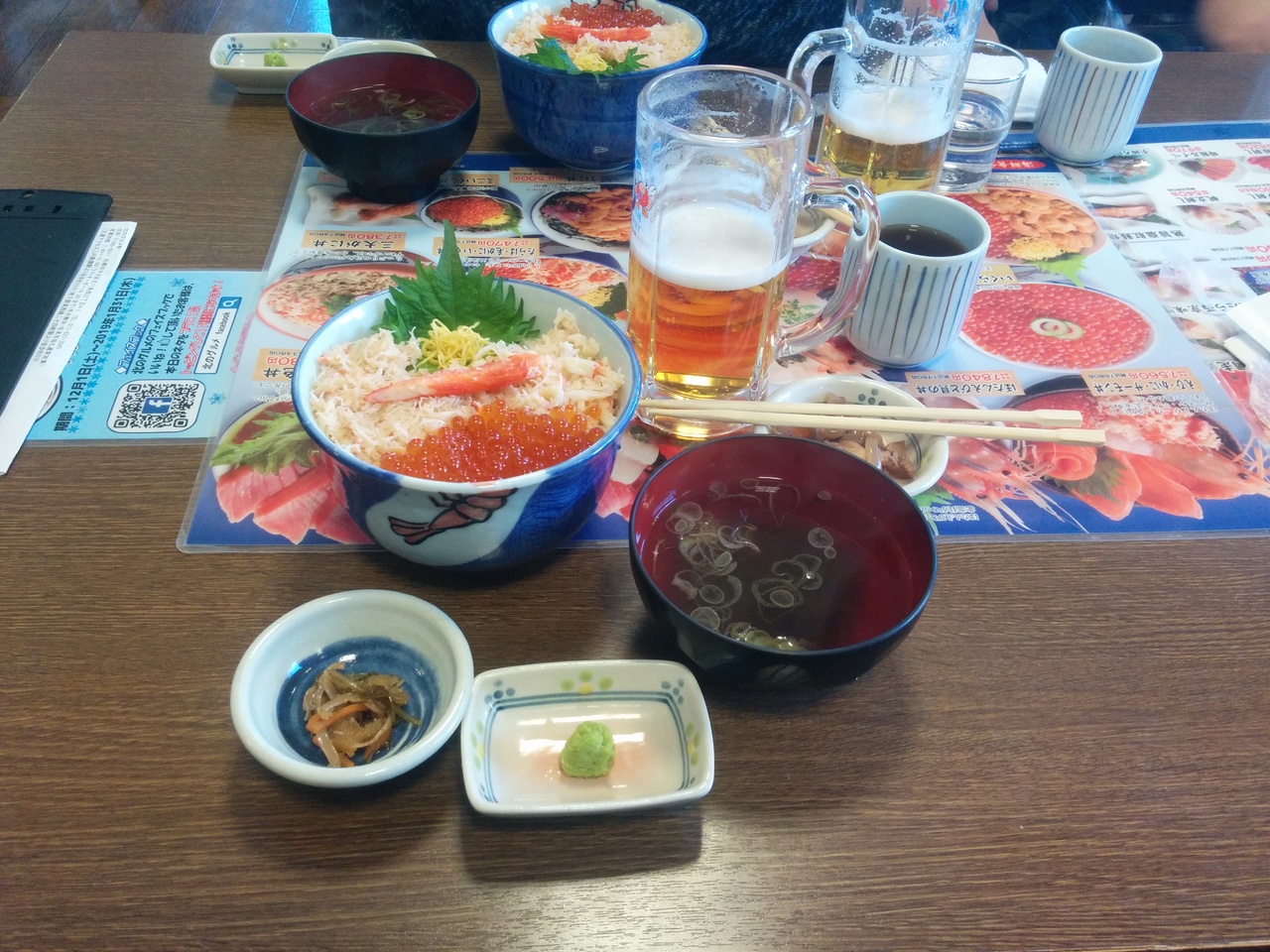 みなさんこんにちは、ふとももぷるぷるです。平成30年12月13日に北海道札幌市中央卸売場外市場にある海鮮市場、北のグルメの中にあるレストラン北のグルメ亭に行ってきました。HISからタラバ、毛がに、いくら丼のバウチャーを頂いたので使いたいと思います。あと生ビールを別途注文して頂きました。タラバ、毛がに、いくら丼は、1580円でした。とても美味しかったです。
