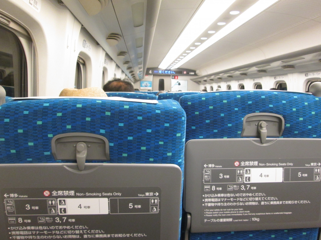 久しぶりに2人席の座席を確保しました。普通車の座席はリクライニングができますが、前に座っている人がシートを倒してくると自分の足元のスペースが狭くなりました。駅に到着する前、下車するときにシートを元の位置に戻すように車内放送がありました。