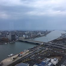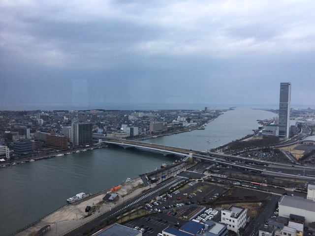 「新潟駅に来たら日本海を見たい」と思いましたが、滞在可能時間が3時間ほどで、そちら方面へのバスが非常に少なく、かつ20分ほどかかり、水族館以外に訪れる場所がなさそうだったため、メディアシップに行ってみました。こちらの展望台は無料で、飲食物など持ち込み可能です。窓際にテーブルとイスがあり、自動販売機で飲み物も売っていました。ここから、日本海、佐渡島(天気が良ければ)、萬代橋、朱鷺メッセ、NIIGATAのオレンジ色のモニュメント、など色々見ることができます。土曜日でしたがあまり混んでおらず、私たちは近くのバスセンターで三日月のイタリアンをテイクアウトし、景色を楽しみながら食べました。