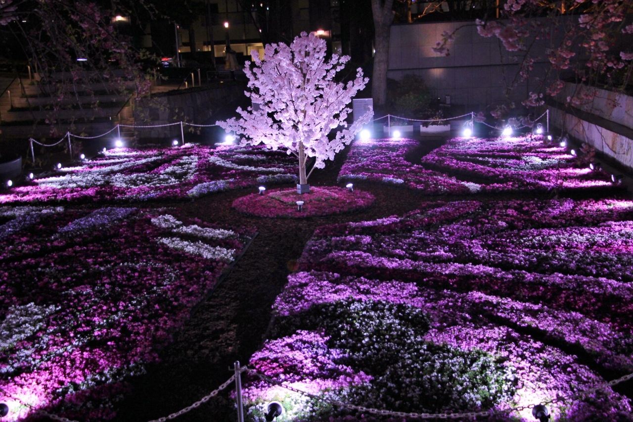 「空の広場」では芝桜によるアートガーデンがライトアップされていてとても綺麗でした。周りの紅枝垂桜はまだ咲き始めたばかりでしたのでこれから楽しめそうでした。