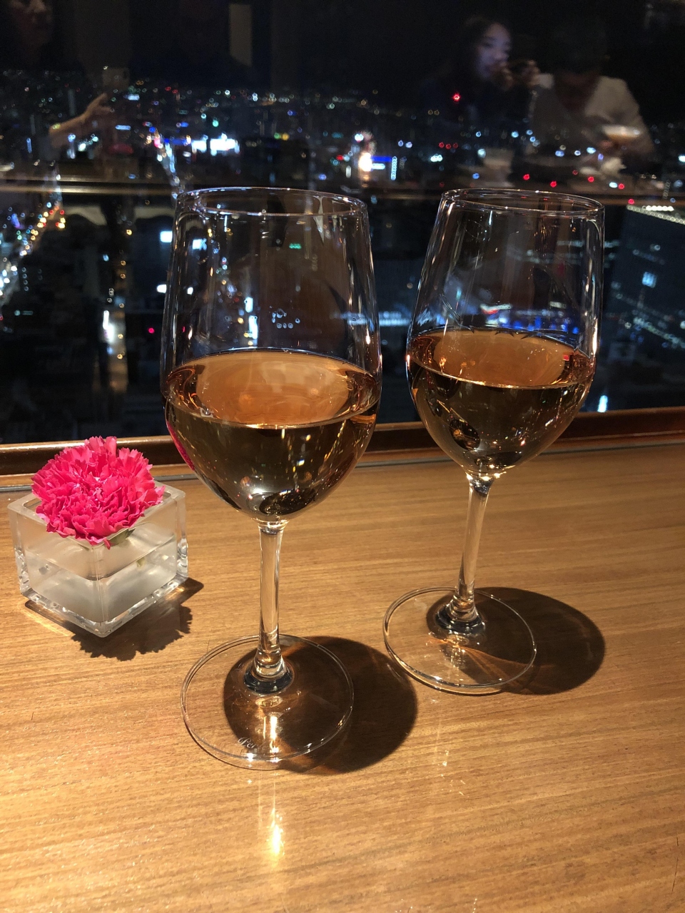 コースメニューが色々あるので、あらかじめウェブサイトなどで選んで予約しておくと便利。私が頼んだのは夜景の見える席で、カクテルつきのコースでした。