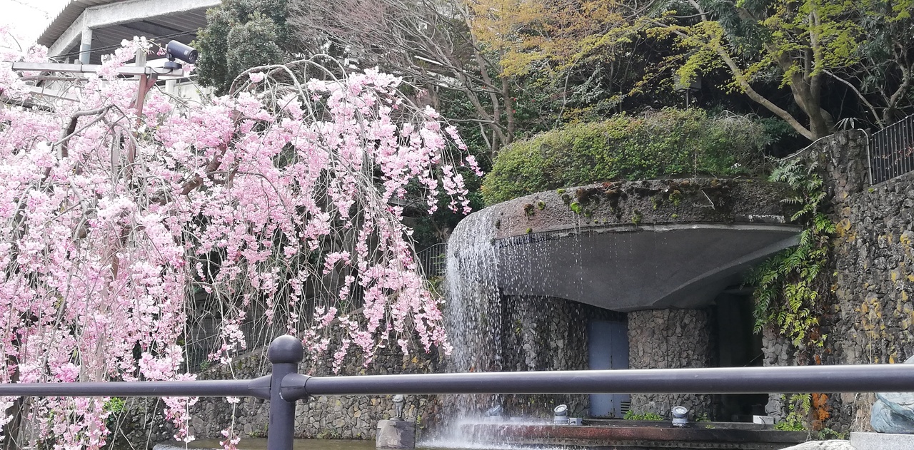 滝があったのですが、中に立っている小さなカッパが可愛かったです。枝垂れ桜が満開で見応えがありました