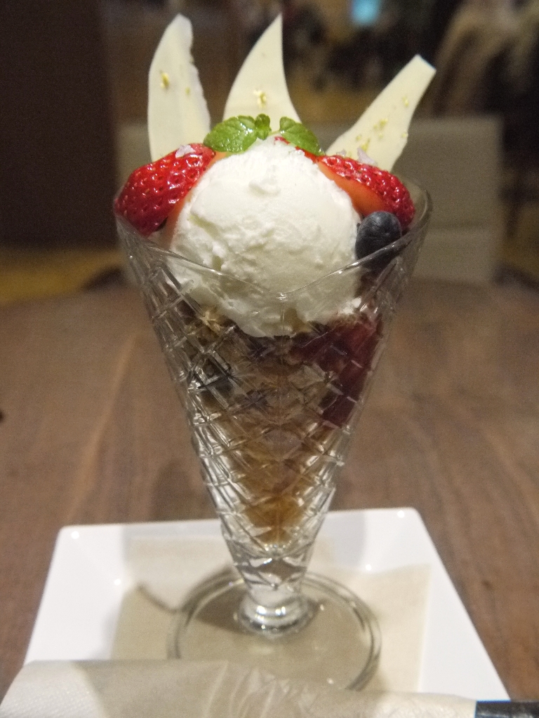 フルーツの甘酸っぱさと、ホワイトチョコレートのまったりとした甘さに、塩ジェラートの塩辛さが複雑に混ざり合った、不思議な味のパフェ。