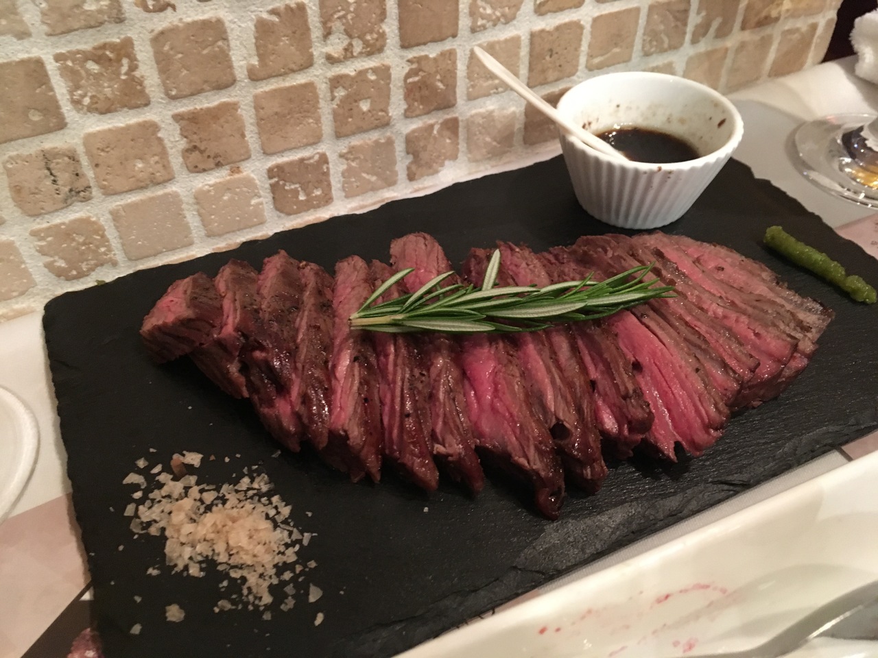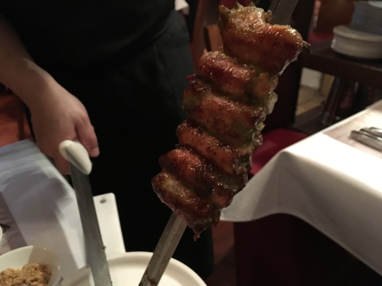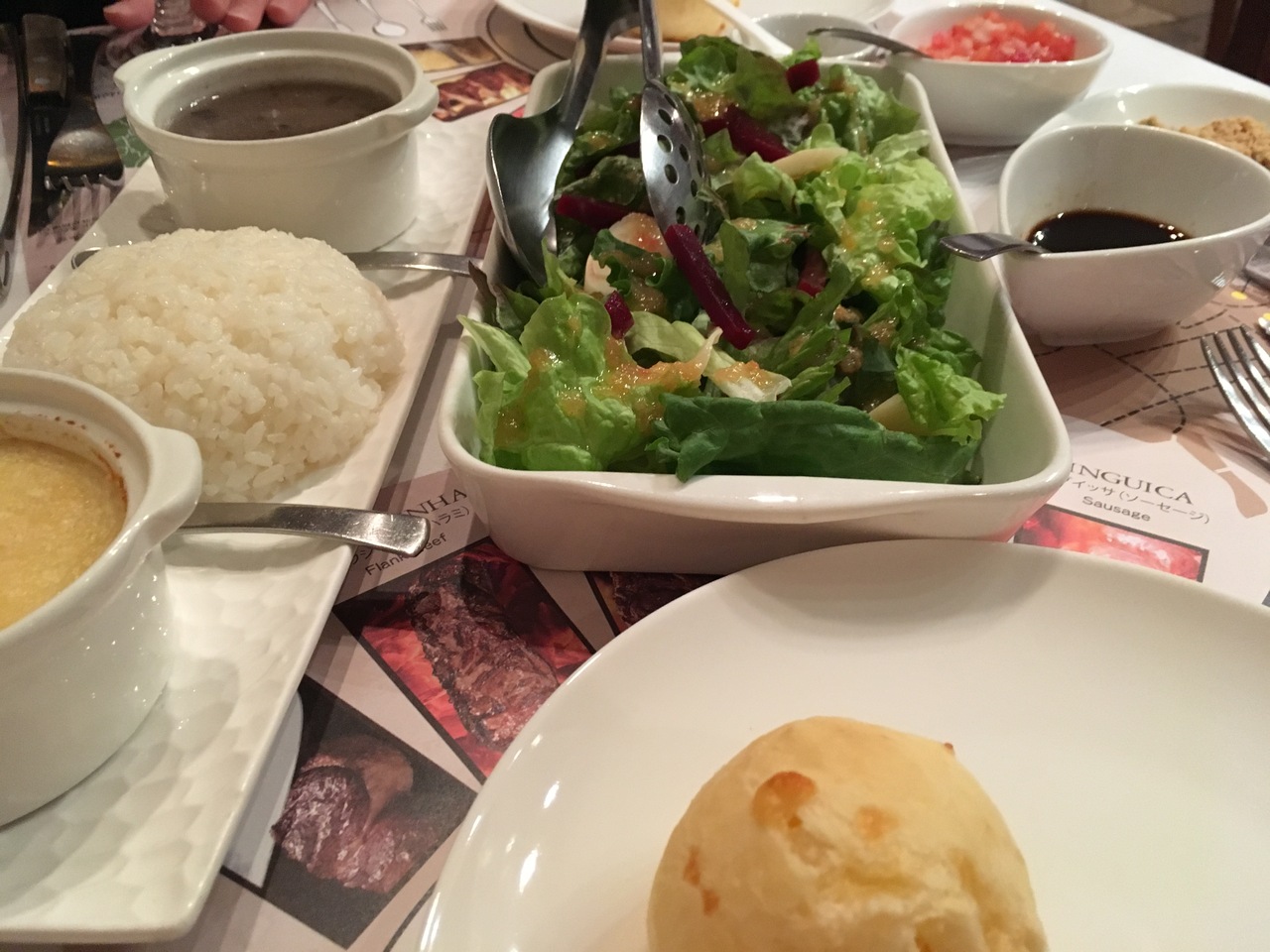 炭火シュラスコ100分コース&栃木県産Aランク黒毛和牛100g付き(テーブル2時間制)というコースで、レッツ、シュラスコ。サラダと付け合わせがまず登場して、その後な炭火で焼かれた肉たちが次々と回ってくる。店員さんが「これは***です」と言って切り分けてくれるのだが、何しろ種類が多いので、どれが何やら分からなくなる。柔らかめの肉、ちょっと硬めの肉、甘味のある肉、香辛料の効きを楽しむ肉など、どの部位だか分からなくなっても、ようするに美味しければ良いのだ。