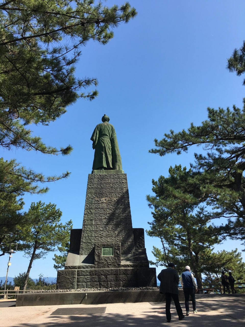 龍馬像は高台の一番高いところにあり、おなじみのポーズで日本海を眺めています。何度も見るものではないかと思いますが、一度は押さえておきたい感じでした。