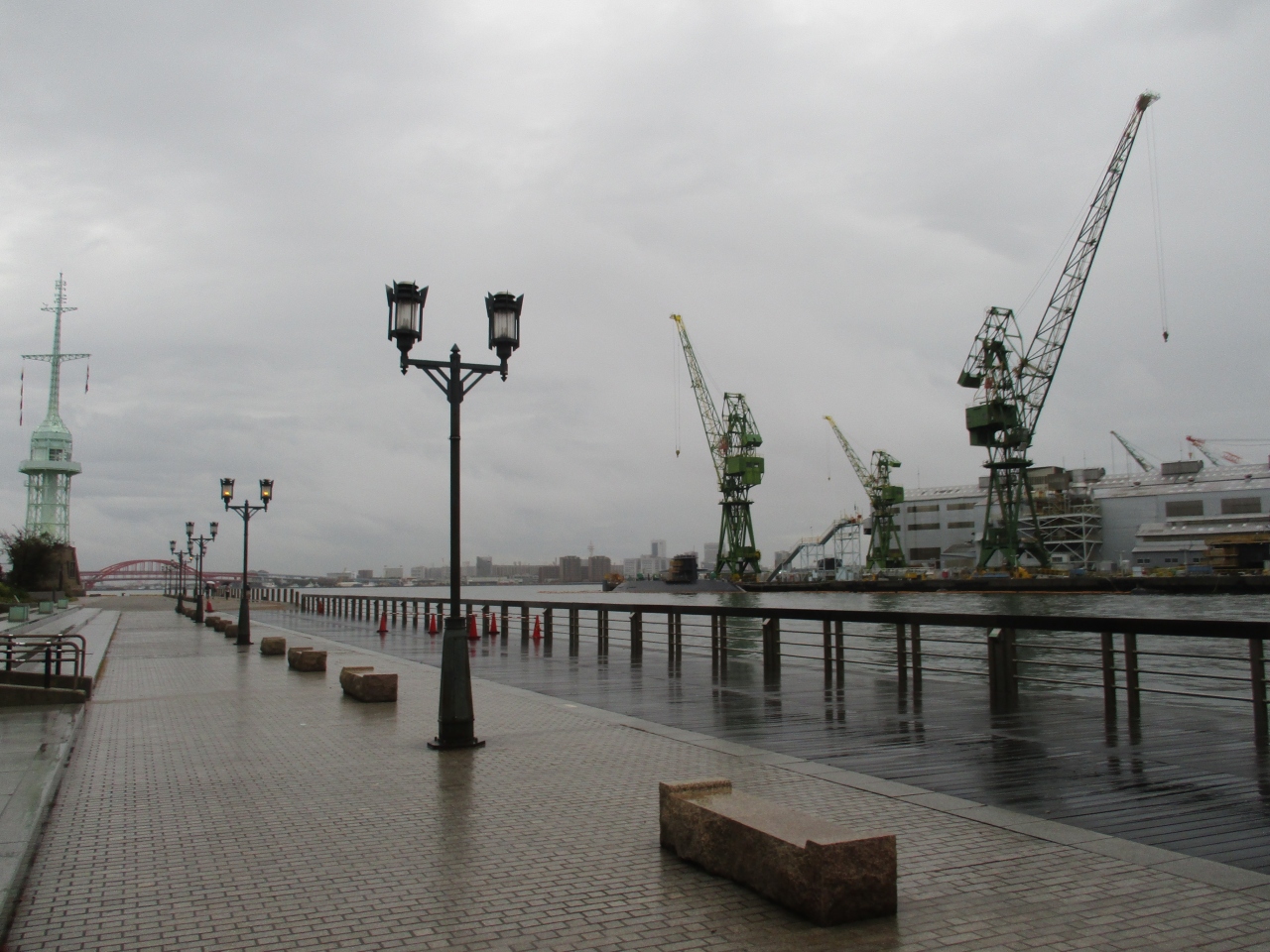 コンチェルトが停泊する海沿いの気持ちのいい空間です。レトロな街灯が立っていて、この道沿いに旧新港の第五突堤信号所も見えるレトロ通りでもあります。ラッキーなことにこの日は天気が悪く、この素敵な道を独り占めして、景色を堪能しました。