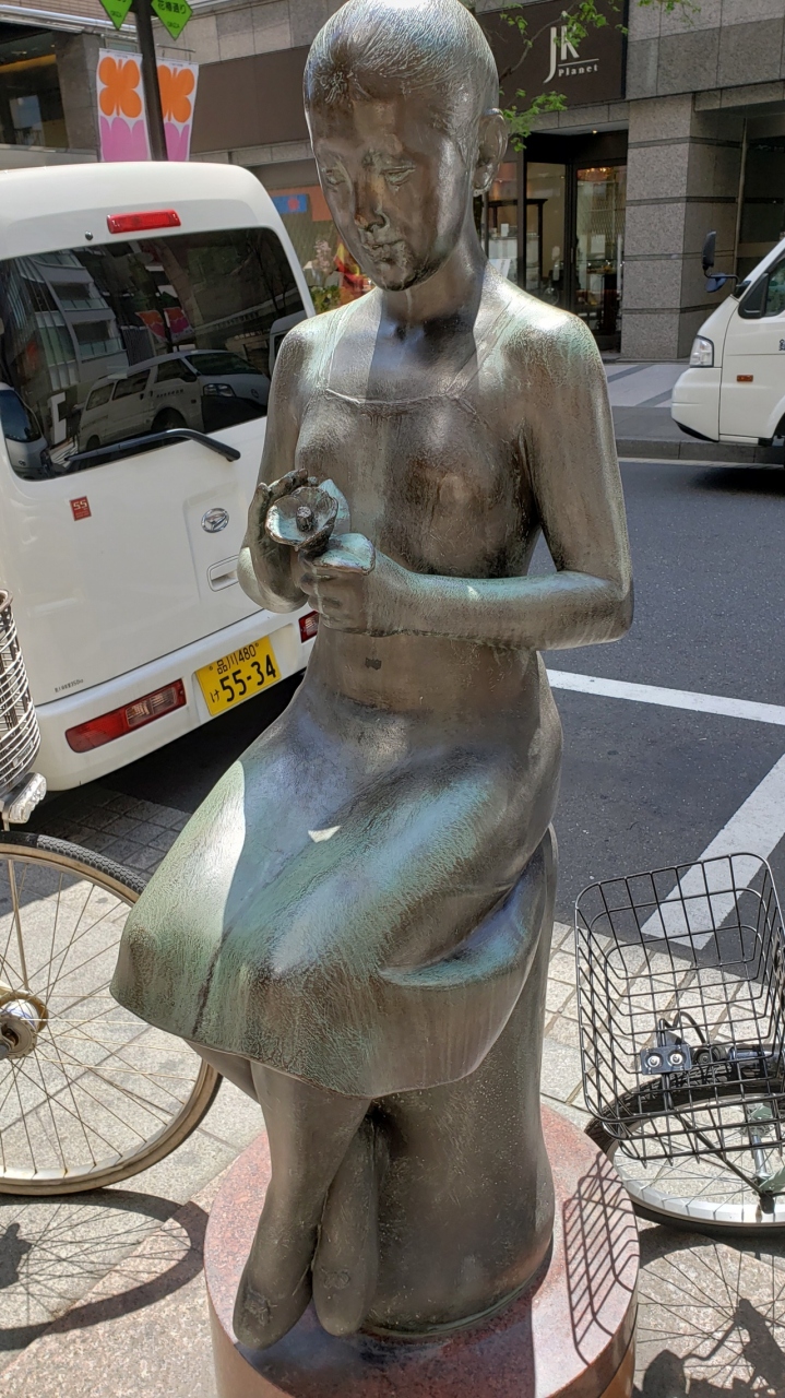 花椿通りのHPでは「(通りの)整備の記念として椿の花を持ったポニーテールの少女「はな」の像が置かれています」と紹介されています、放置自転車も何とかしてほしいですね~せっかくの像が残念です。