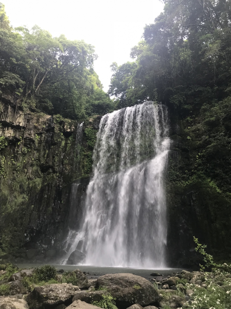 途中から水の流れる音はするものの姿が見えず地味に歩いて行くと、なんとも大きな滝が現れます。