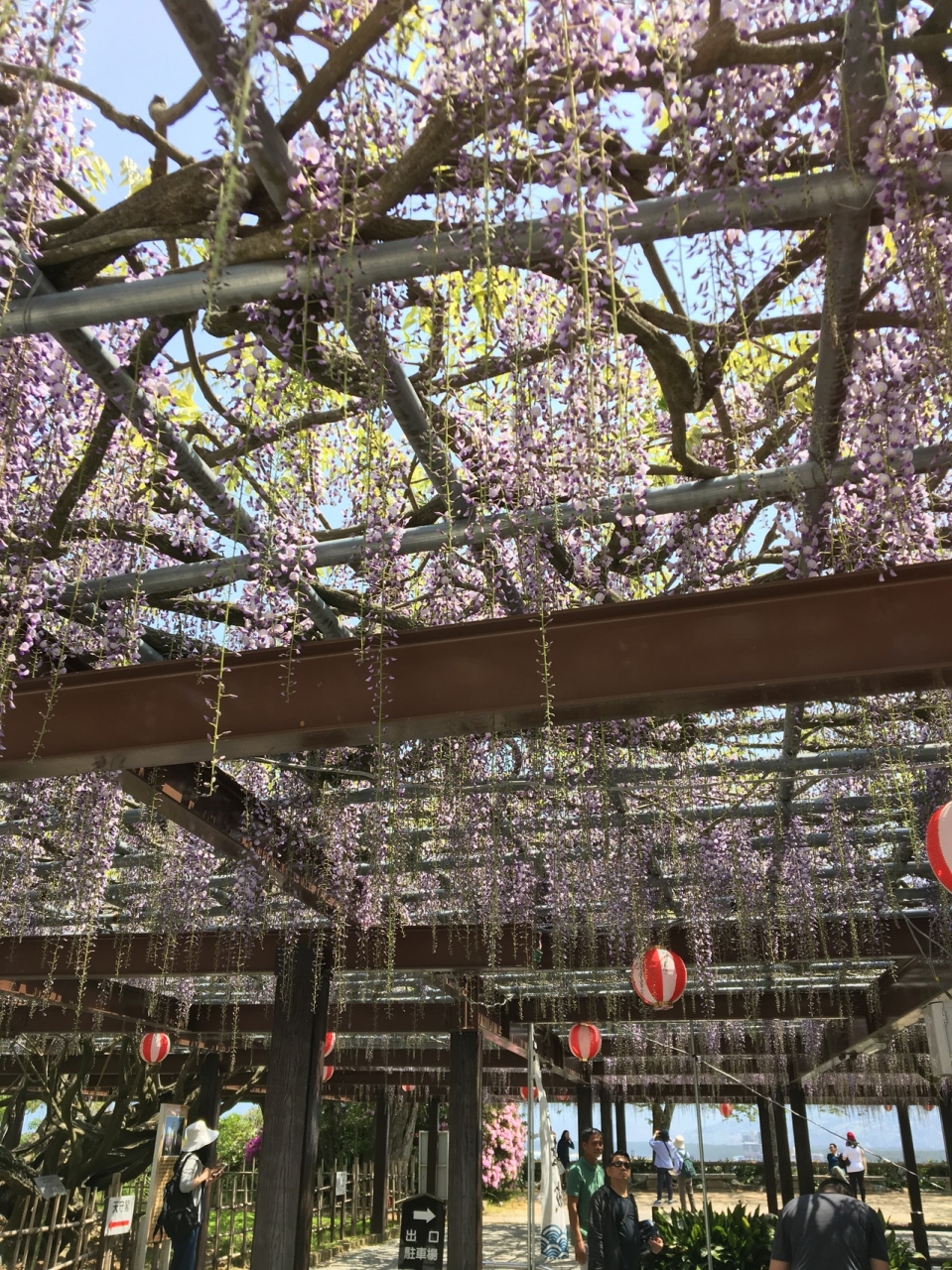 訪問時は海外からのクルーズ船がちょうど寄港しており、欧米のゲストが団体で来ていました。庭の藤の花もちょうど5分咲くらいでキレイでした。