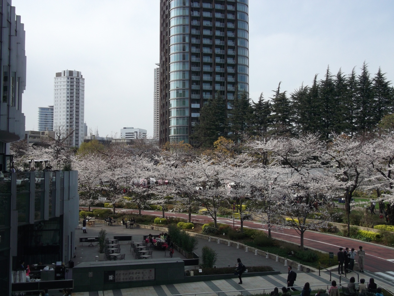 大江戸線六本木駅直結の東京ミッドタウンでは、公園と通りに沿って並ぶサクラの木々が春の訪れとともに美しい景観を造り上げます。広場にはテラス席が設けられ、のんびりとサクラ見物を楽しむ姿も見られました。日が暮れると桜並木はライトアップされ、日中とはまた違った景色が広がっていました。