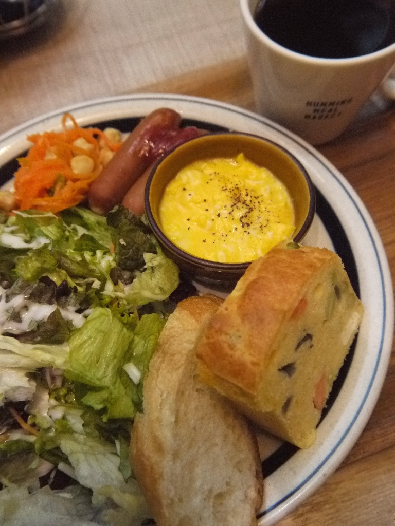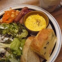 ケーク・サレ、プリエーゼ、サラダ、スクランブルエッグ、ソーセージ、本日のデリ、ドリンクから成る。