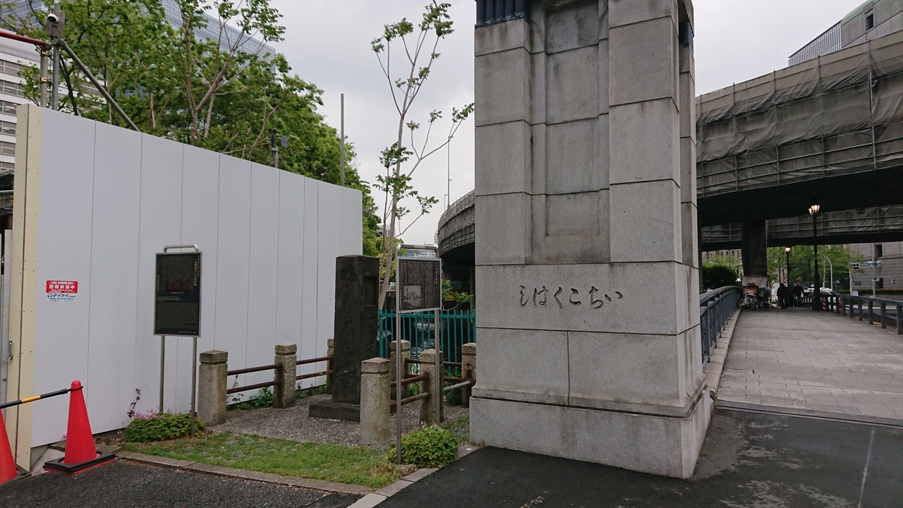 一石橋と書いてどう読むのだろうと思ったら、この柱に「しはくこちい」と書いてありました。右から読むのですね。首都高が覆い被さっているのが日本橋らしさになってしまいましたが、それでも存在感のある柱でした。