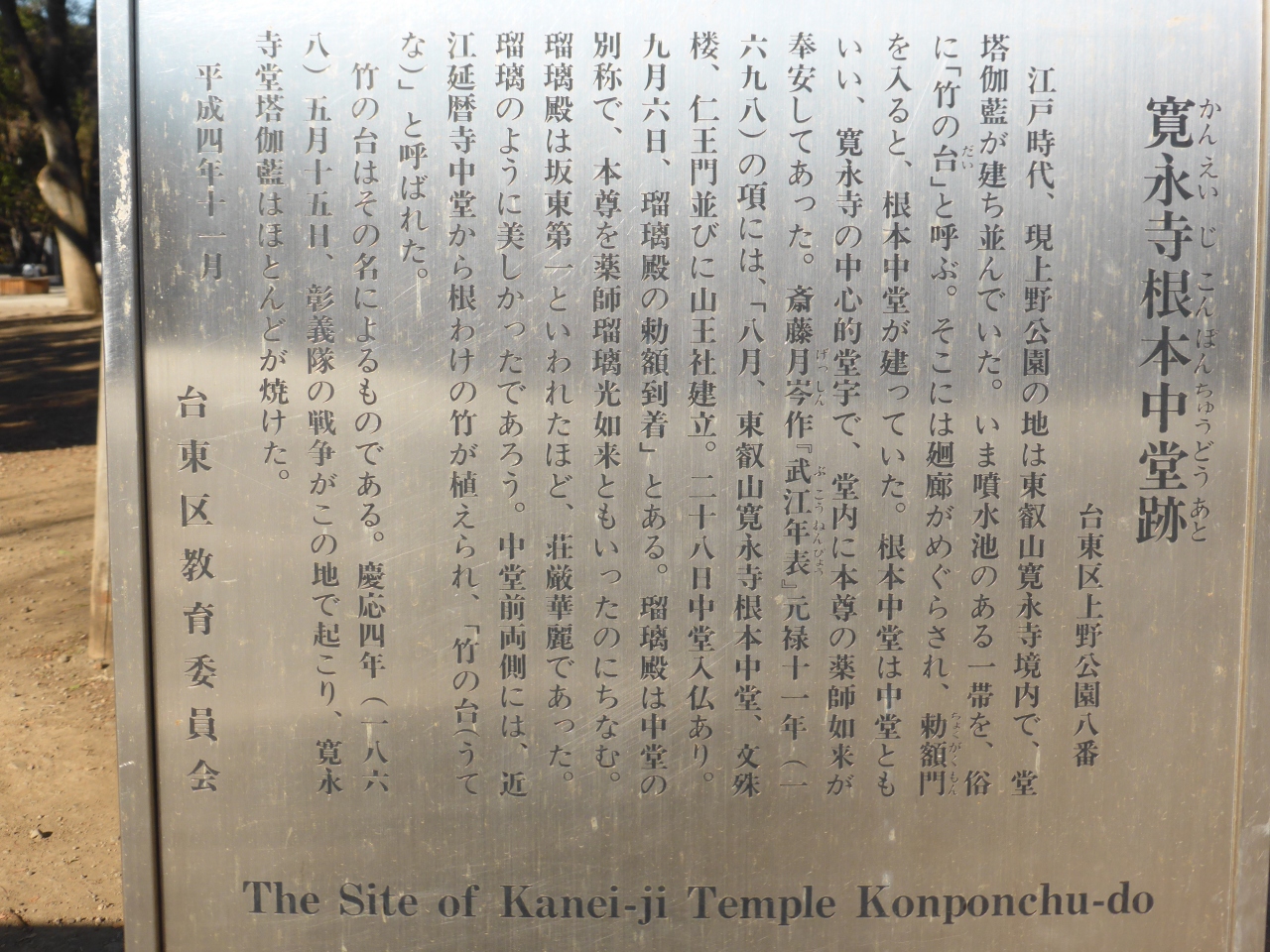 スターバックスと噴水の間にあります。寛永寺は今の上野公園の噴水の場所にあったのだそう。これがまず知りませんでした。看板がひっそりとあるのみですが、横には歌川広重の「東都名所上野東叡山全図」の記念碑があり、目の前に広がる噴水と見比べるとその光景が目に浮かびます。