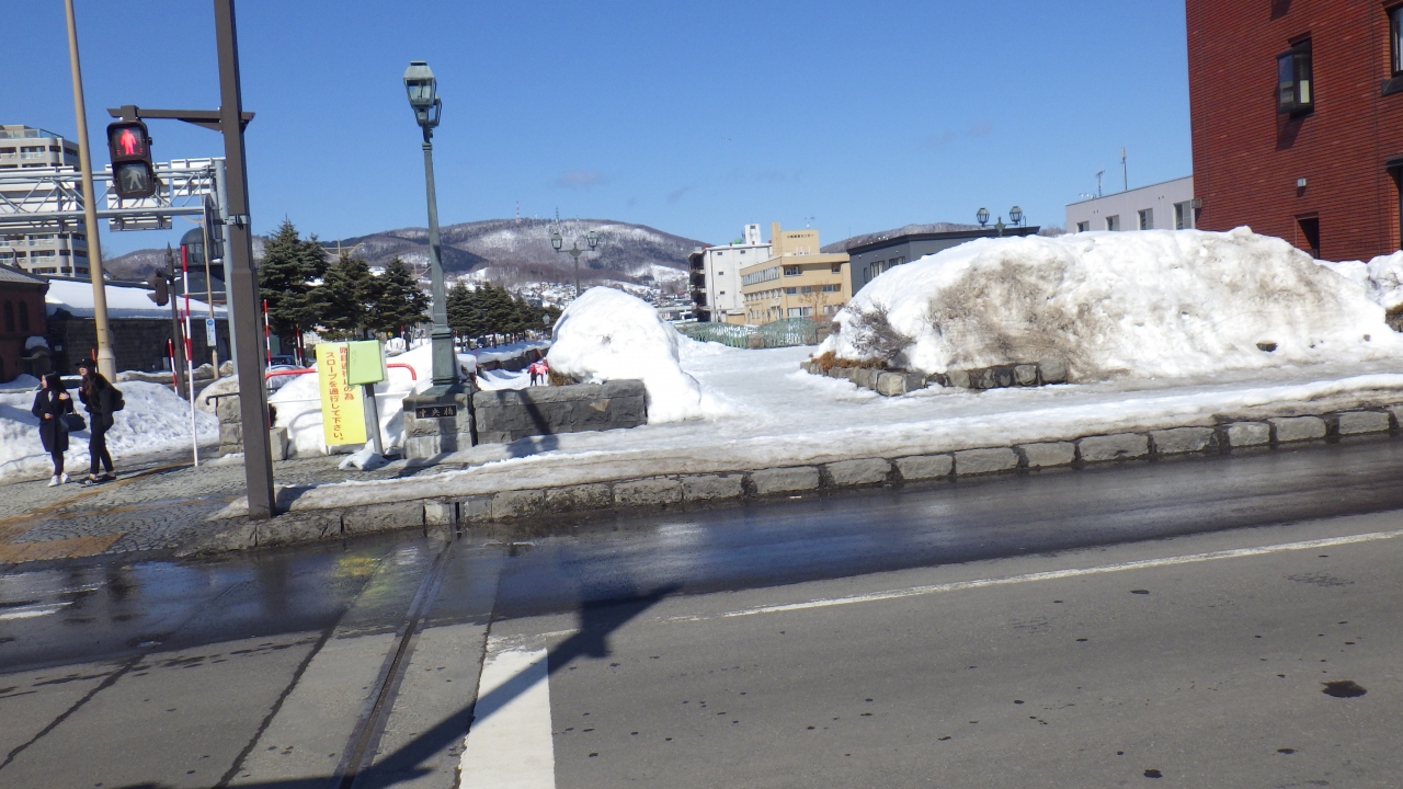 駅から運河まで片側二車線両側に歩道があり結構広い道路で歩きやすいのですが、駅から下り坂で足腰に不安のある人には帰り道に苦労するかもしれませんし、3月でも日陰には雪がある場合が多いので注意が必要です。