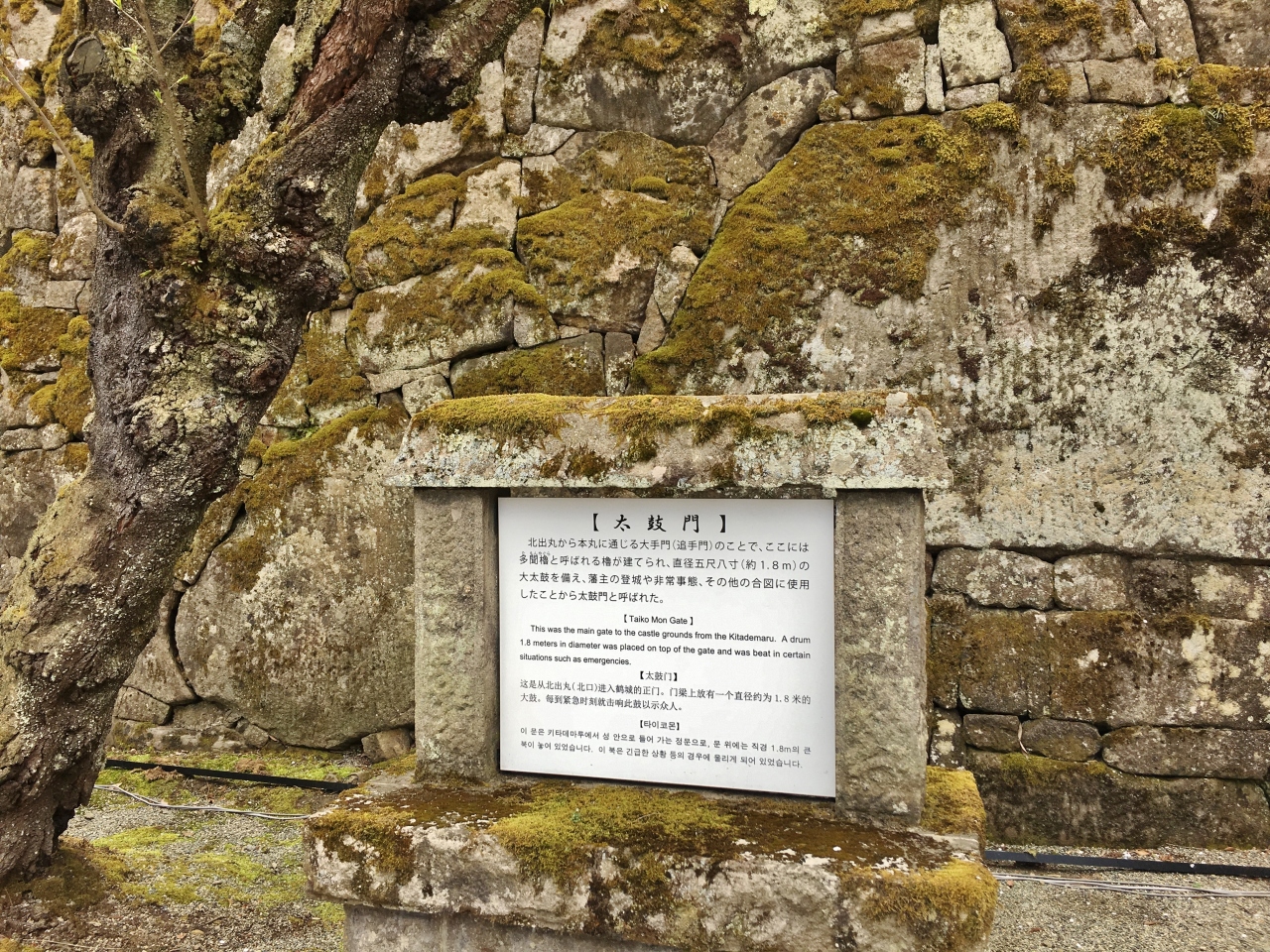 太鼓門の別名は大手門、今は石垣しか残っていませんが、かつてはここに本丸への敵の侵入を食い止める枡形が設けられ、太鼓が置かれていたそうです。