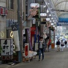 熱海駅前のロータリからすぐ右側にある平和通り商店街。全長200mほどのアーケード商店街になっていて、駅からは天候(雨)を気にせず歩いて行けます。なだらかな下り坂に沿ってお土産やさんと飲食店が混在する通りで、湯気の立つ温泉まんじゅうや海産物を売るお店が目立ち、商店街の中ほどには、金色夜叉の貫一お宮の顔ハメ看板などもあり、温泉地らしい雰囲気があります。熱海駅前にはこの平和通り商店街と仲見世商店街という2本の商店街が横並びにあるので、一方を通って行き、帰りはもう一方を通ると両方無駄なく回れるので便利です。