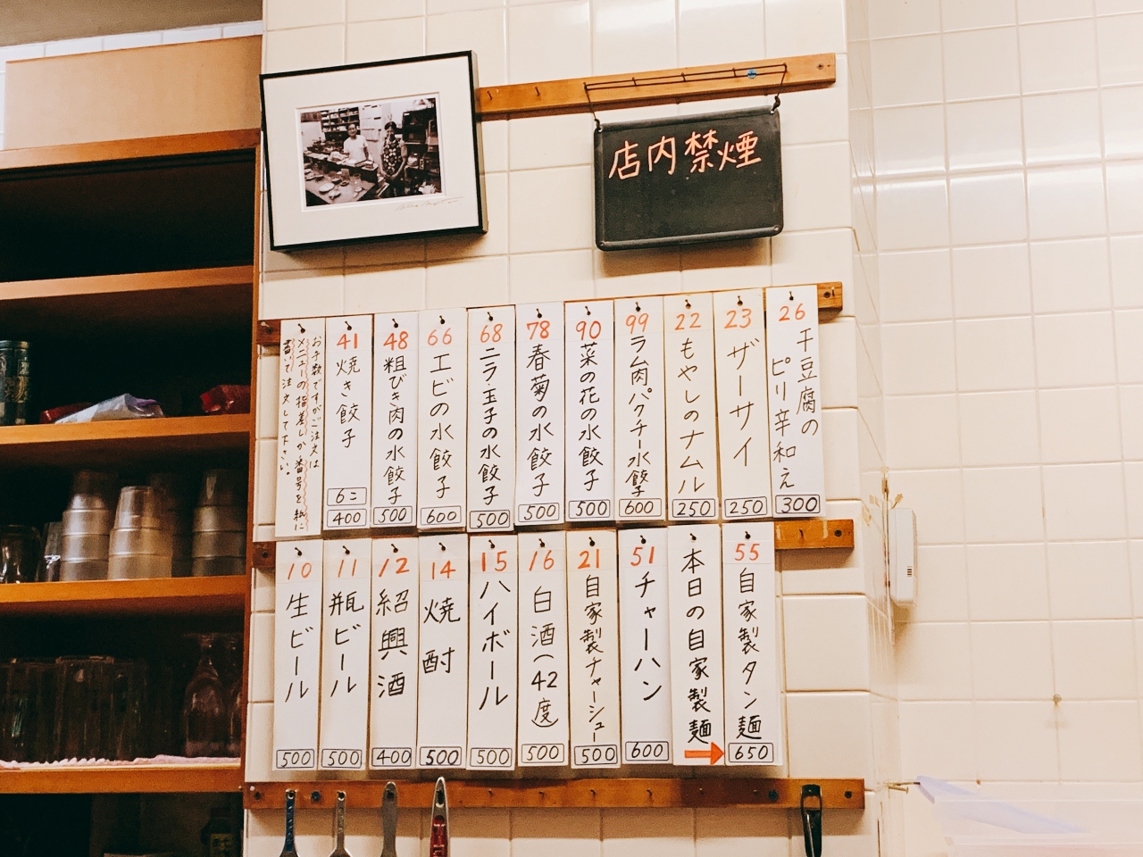 メニューは番号を書いて手渡す方式。店名からして餃子、しかも本場式の水餃子の種類が多い。