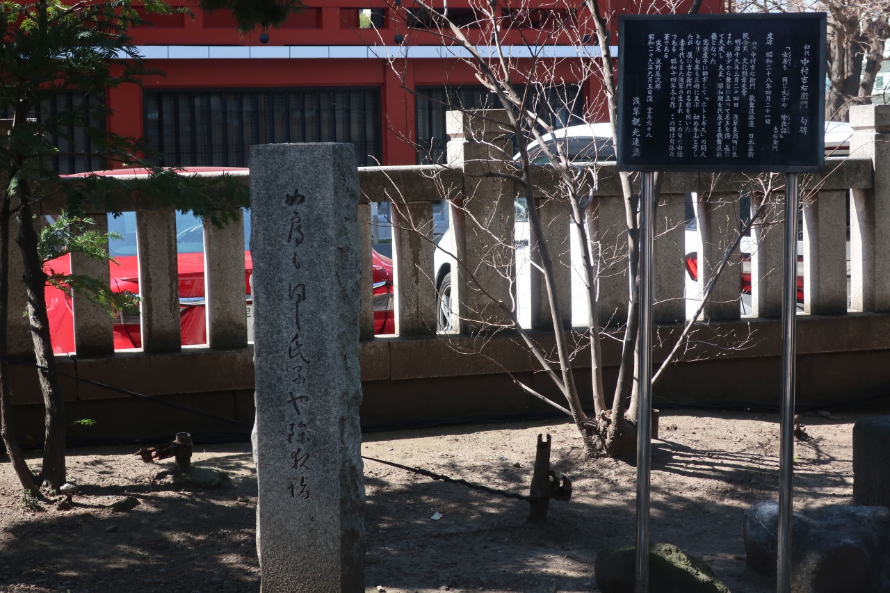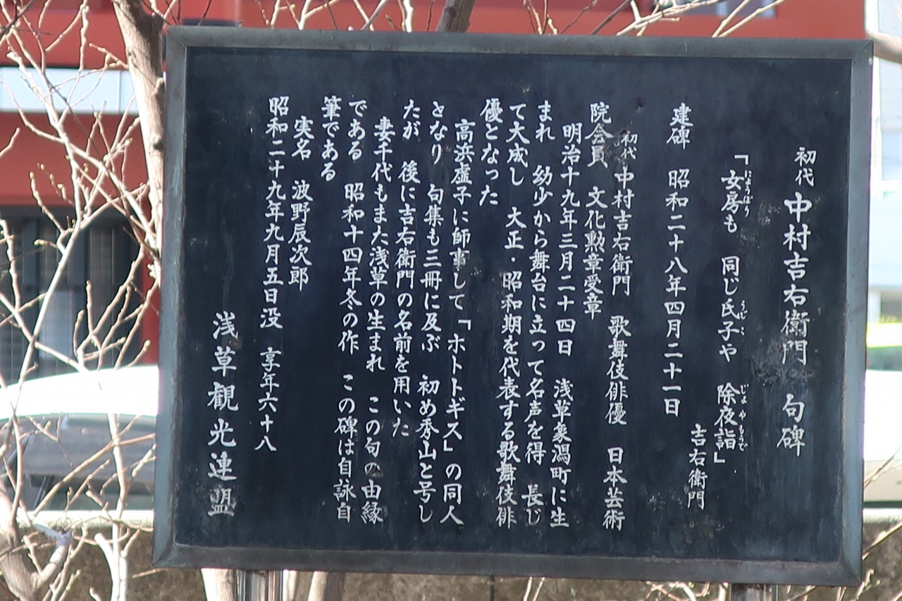 浅草神社の境内、神楽殿の反対側には多くの石碑等のモニュメントが建てられています。初代中村吉右衛門句碑もその中の一つです。明治から昭和時代まで播磨屋と呼ばれた大歌舞伎役者の句碑です。鬼平犯科帳の元吉右衛門は孫に当たります。句碑には「女房も同じ氏子や除夜詣」と詠まれており、同じ浅草出身で夫婦仲が良かったことが伺える句だと思いました。