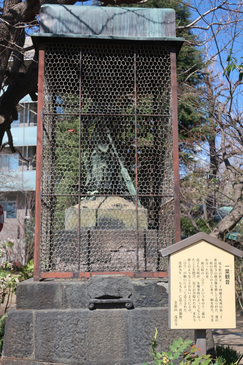 浅草寺の本堂裏にある駐車場の北側にある植え込みの中に金網で囲われた銅製の観音菩薩が祀られています。この観音様が一葉観音です。金網で見え辛いのですが、蓮の花びらのを舟にして頭上に笠をかぶって櫂を持つ姿が、説明版に書かれている物語の言い伝えを良く物語っているように感じました。浅草には屋外にも沢山の仏像が寄進されており如何に人気があったことが分かります。