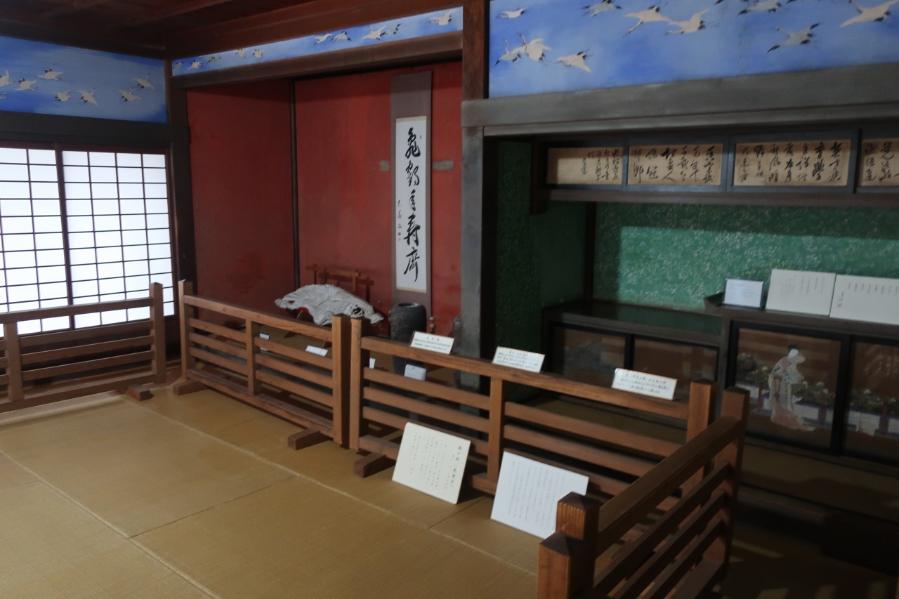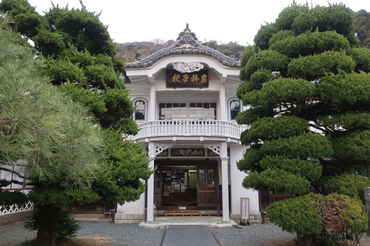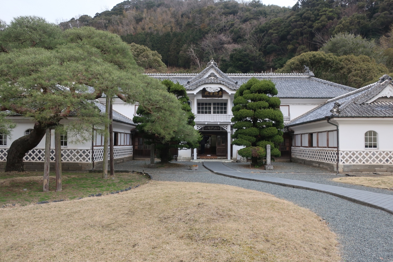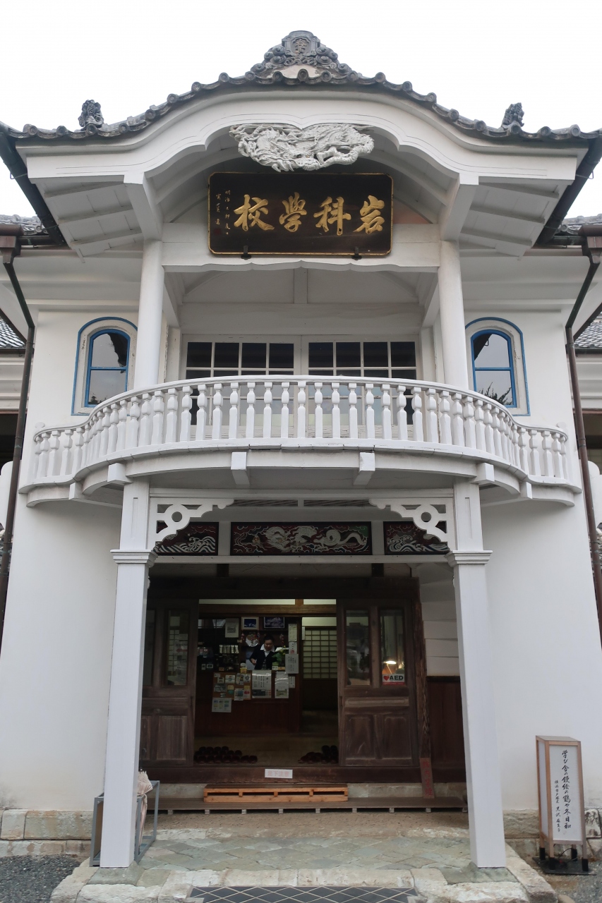 松崎の市街から2,3km程山側に入った岩科地区にある日本で3番目に古い洋風学校建築です。松崎の伝統的なナマコ壁とバルコニーにある洋風建築の和洋折衷の木造2階の建物です。内部では当時の教室が再現され、見物は2階の日本間の客室にある入江長八の鶴の作品。青い壁に鶴の舞う姿は見事です。