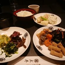 席に案内され、バイキングですのでご自由にどうぞと促され、漬け物やおばんざいを取り、戻ってくると、ごはんとお味噌汁が置かれていました。お漬け物もおばんざいも、4~5種類ぐらいづつ並んでいます。