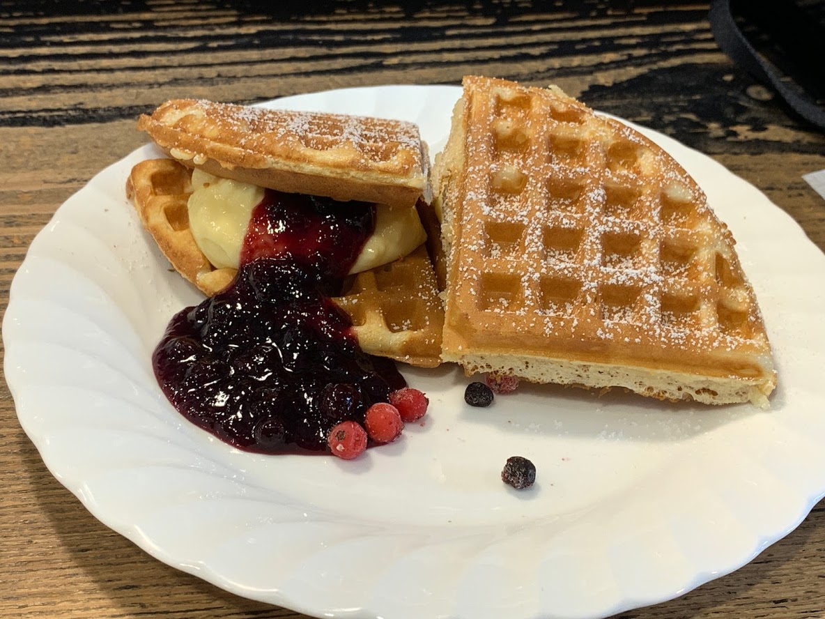 ちょうど15時のおやつタイムだったのでカスタードクリームと、ベリーソースのワッフルをいただきました。
