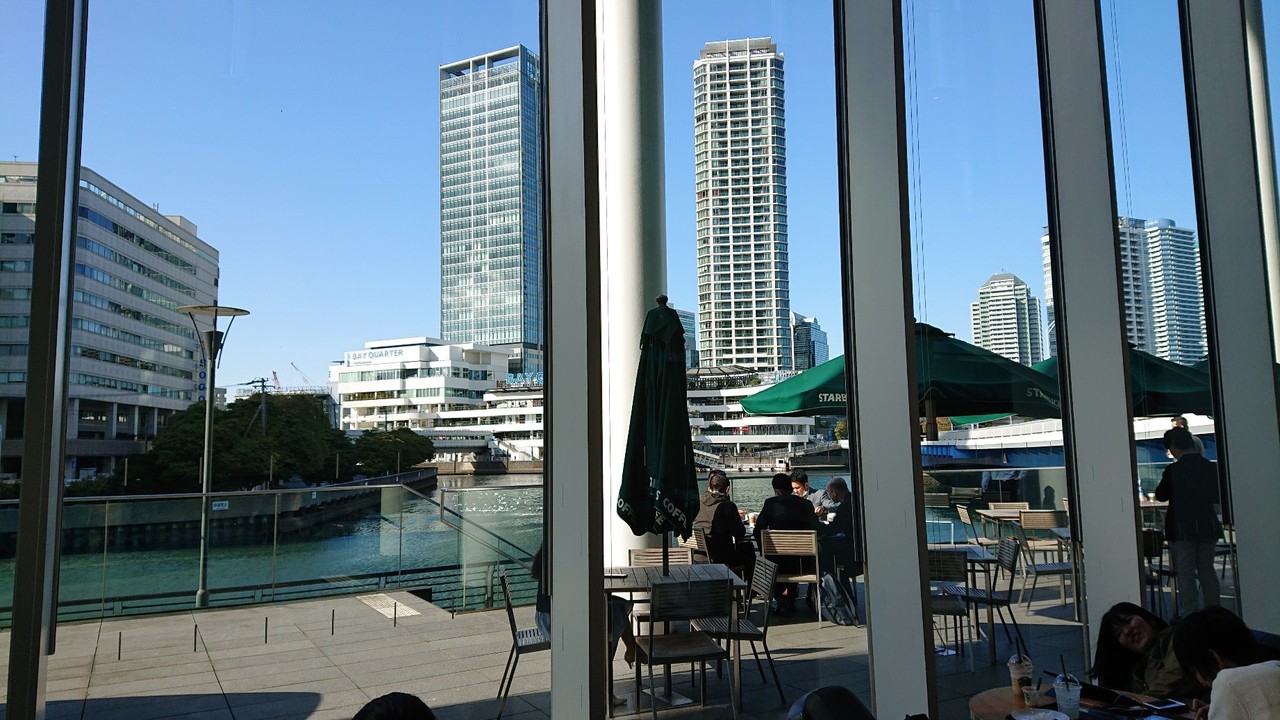 みなとみらいの景色と日産グローバル本社の新モデル車の展示を楽しめるスタバ。
