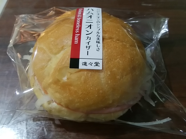 カイザーロールにハムとスライスオニオンという構成も同じ。でも進々堂のほうがオニオンが多くて美味しいかもーってちょっと思った。