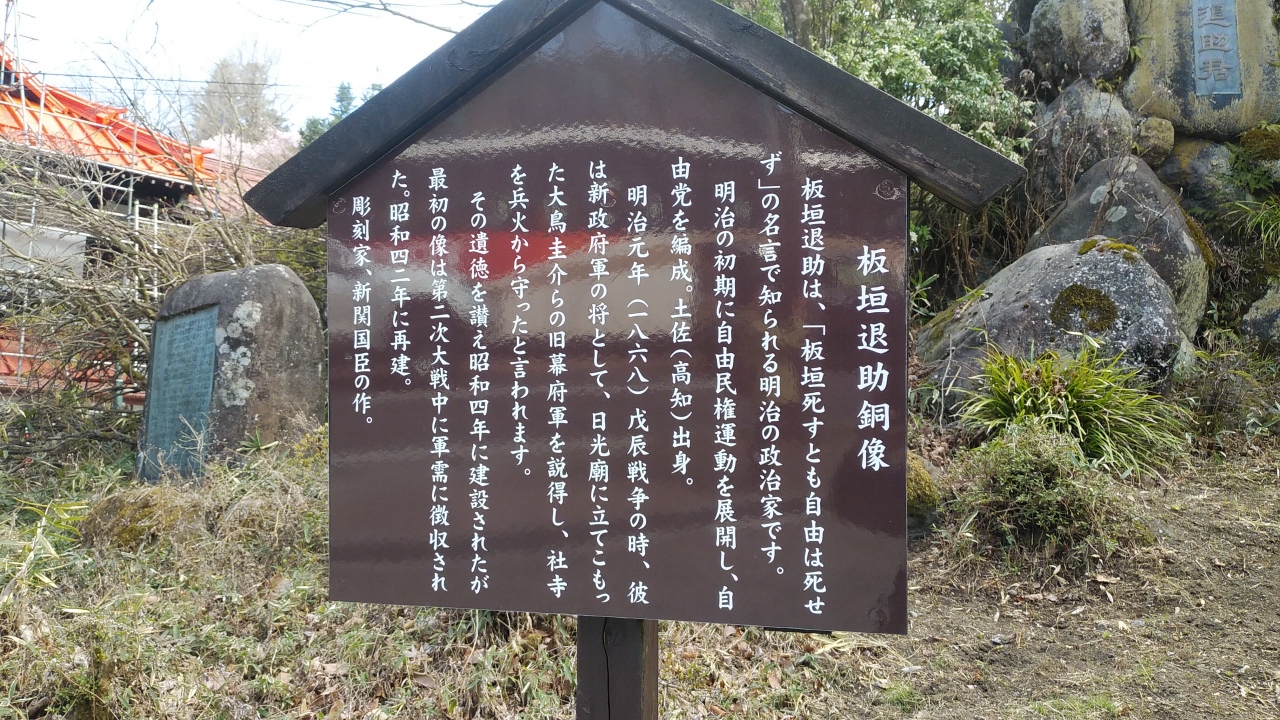 天海大僧正の対面の日光金谷ホテルの入口にあります。板垣退助は明治初期に自由民権運動を展開し、自由党ほ結成した政治家で、「板垣死すとも自由は死なず」の名言で知られています。板垣退助の像は一昨年行った高知城にもありましたが、日光に何故板垣像があるのか不思議でしたが、、戊辰戦争の際、日光廊に立て籠った幕府軍大鳥啓介らと対峙した官軍の将であった板垣は、二社一寺のある日光を戦火に晒すことを避けるため、幕府軍に無欠開城を迫り日光が戦火から免れ、その遺徳を称え昭和4年に銅像が建てられたそうで、32歳当時に官軍の服装で日光の街並みを眺めている銅像だそうで、観光する度に歴史の勉強になり高知、岐阜以外にもあるかもしれません。