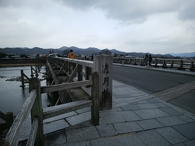 京都の有名観光地、嵐山の有名な橋、渡月橋(とげつきょう)です。桂川にかかる橋です。この橋を松尾大社側から渡ると、そこはとっても人通りの多い、人気なエリアが広がります。