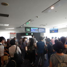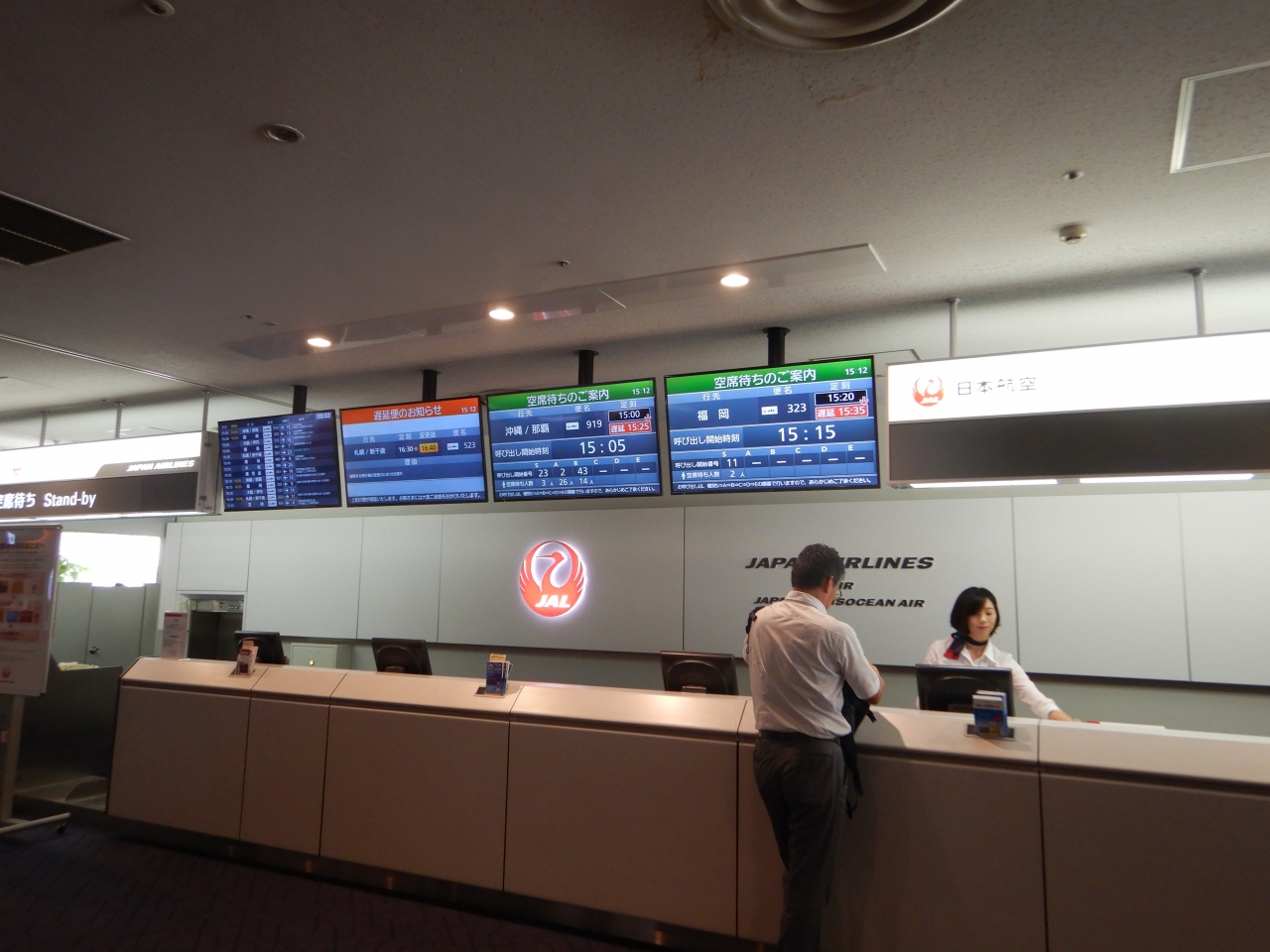 7月1日に羽田発のJAL919便を予約したが、台風の影響で運休。翌日の便への変更をネット上から行い、7月2日のJAL919便が取れた。荷物を預けるためにJALのカウンターへ行く。便の変更をする人などで、混雑していたが、対応は丁寧だった。1便早いものに変更できるとと言われたので、変更したが、搭乗便は台風の影響が完全消えたわけではなく、30分ほど出発が遅れたので、結局元の便と大して変わらない時間に到着した。