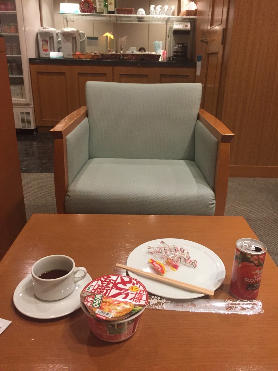 ラウンジと言っても、カップ麺(赤いきつねと緑の、たぬき、カップヌードル)とちょっとしたお菓子にアルコール、ソフトドリンクがあるだけですが搭乗時間まで携帯の充電が出来ゆっくり出来るだけでありがたいです。そして私は、決まってトマトジュースを飲んで飛行機に乗ります。