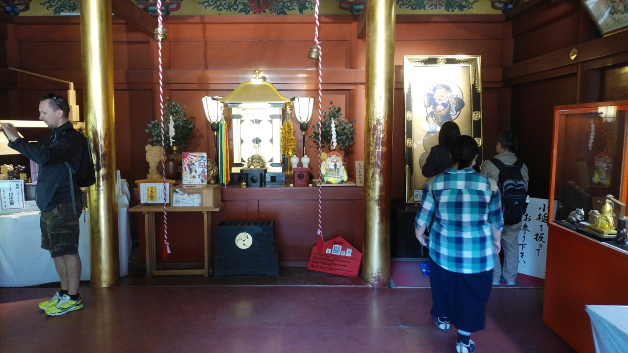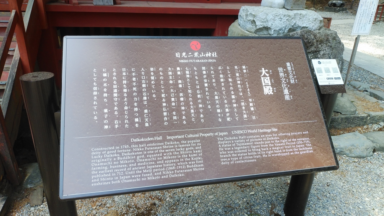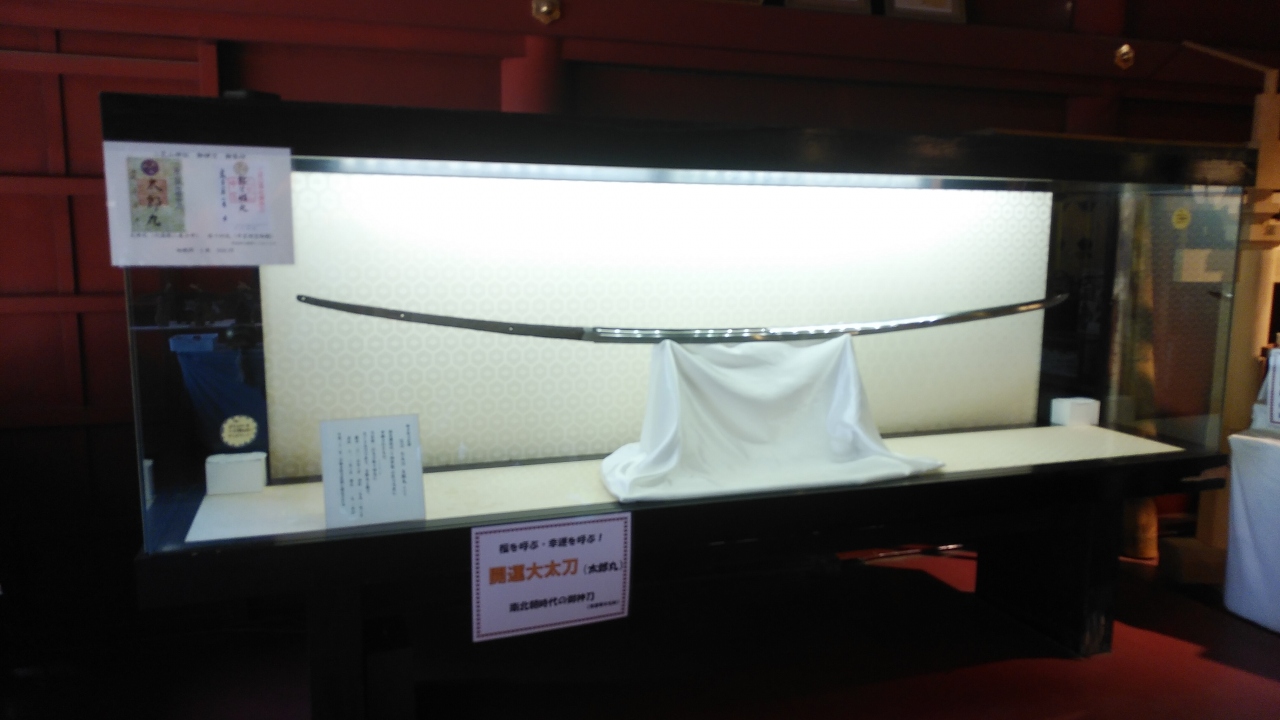 神苑を通過すると神興舎の次の建物で,こけら葺き方形造りの建物で正面には手すり(高欄)付の階段があり、後方に殿舎を取り囲むようにした朱色の縁があり、「折れ扉」唐様(禅宗様式)で、框(かまち)には金が装飾されていて、確か輪王寺にも同じような建物があったと思います。出雲大社との縁が深いのか、祭神は「大国主大神」と同じで後に「大黒天」として信仰されたそうです。堂内には開運願いで小槌を振って「招き大国様」に参拝すると御利益があると言うので参拝しました。また、開運大太刀という大きな太刀も展示され見事な太刀でしたる