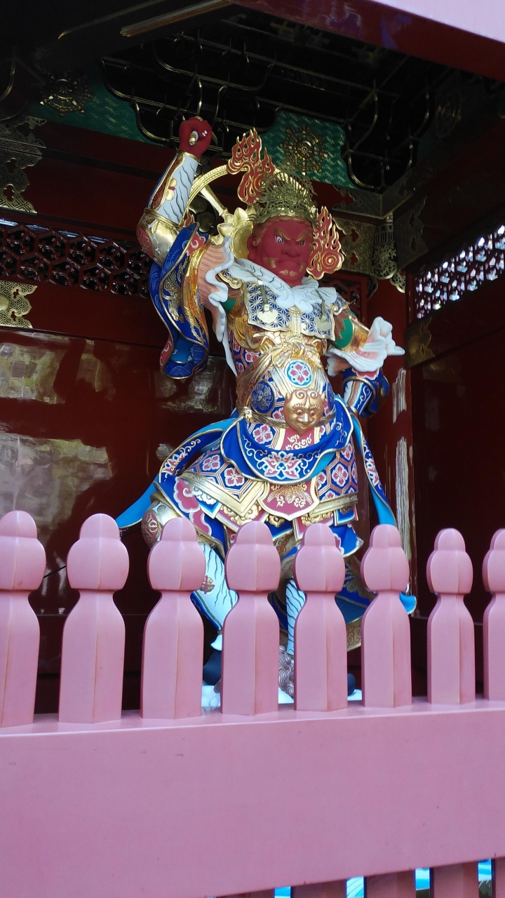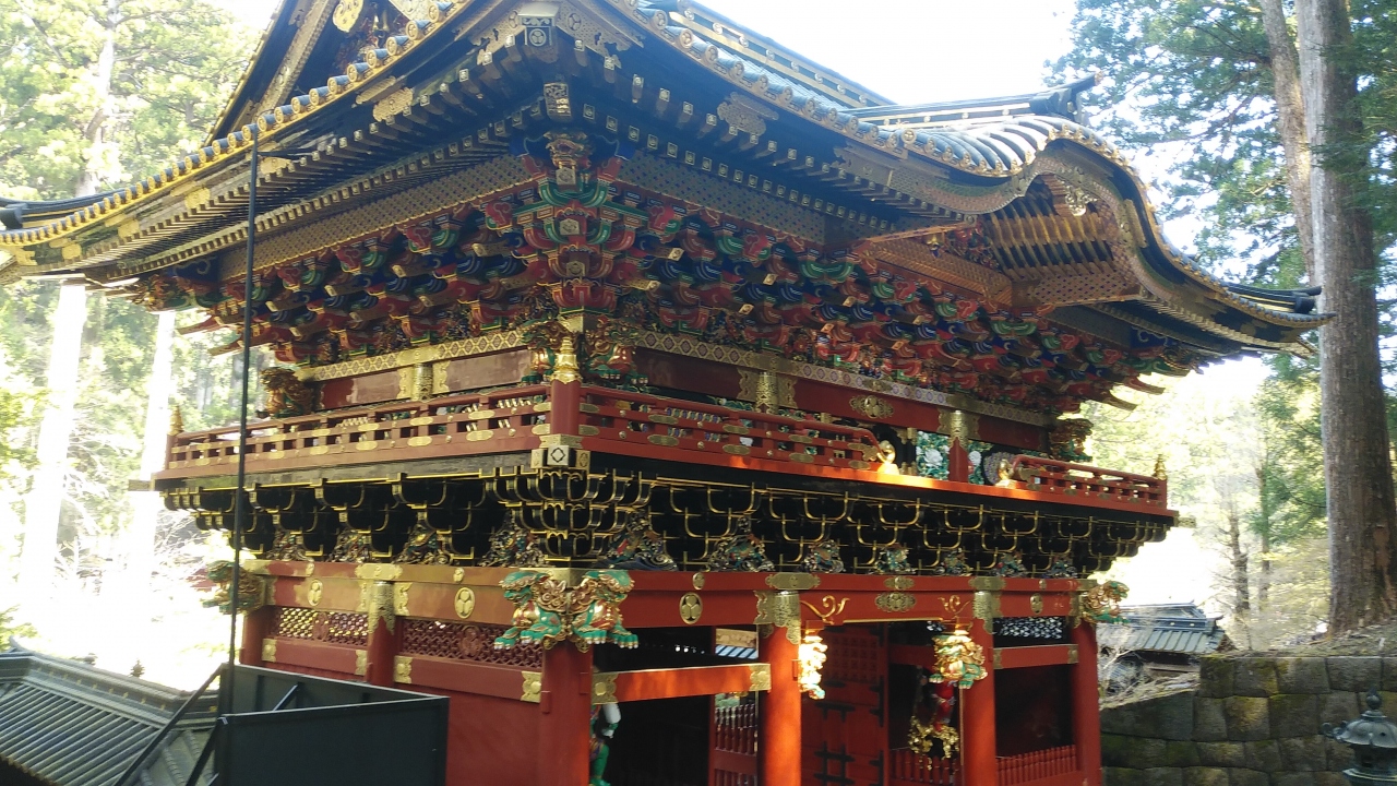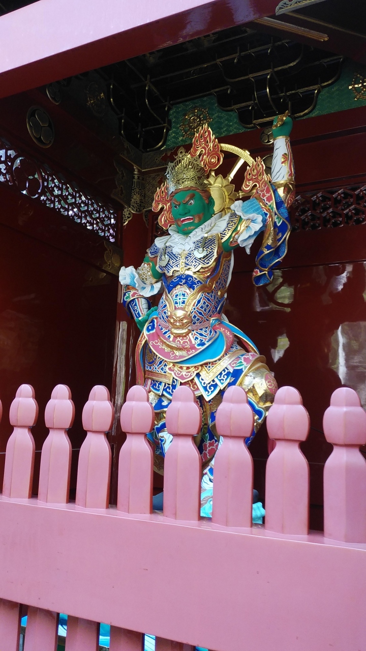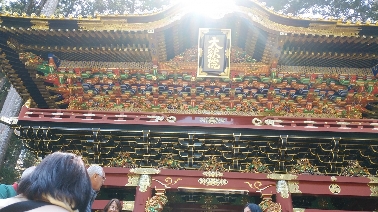 綺麗で圧倒されるような雄大な門で、去年に改修工事が完了し10数年前に訪問した時より素晴らしいものに変貌していました。陽明門と対をなすような朱色を基調とし、金色が冴えていて門の上部が特に美しかったです。また門の左右には二天門の由来となる四天王の「持国天」と「広目天」が安置されており、仁王門より全身が煌びやかでした。日光山で一番大きな門で、三間一戸、八脚楼門、入母屋銅瓦葺で前後の屋根には唐破風がしつらえてあり、真ん中に掲げられている大獣院の「扁額」は後水尾天皇の「宸筆」(天子の直筆)だそうです