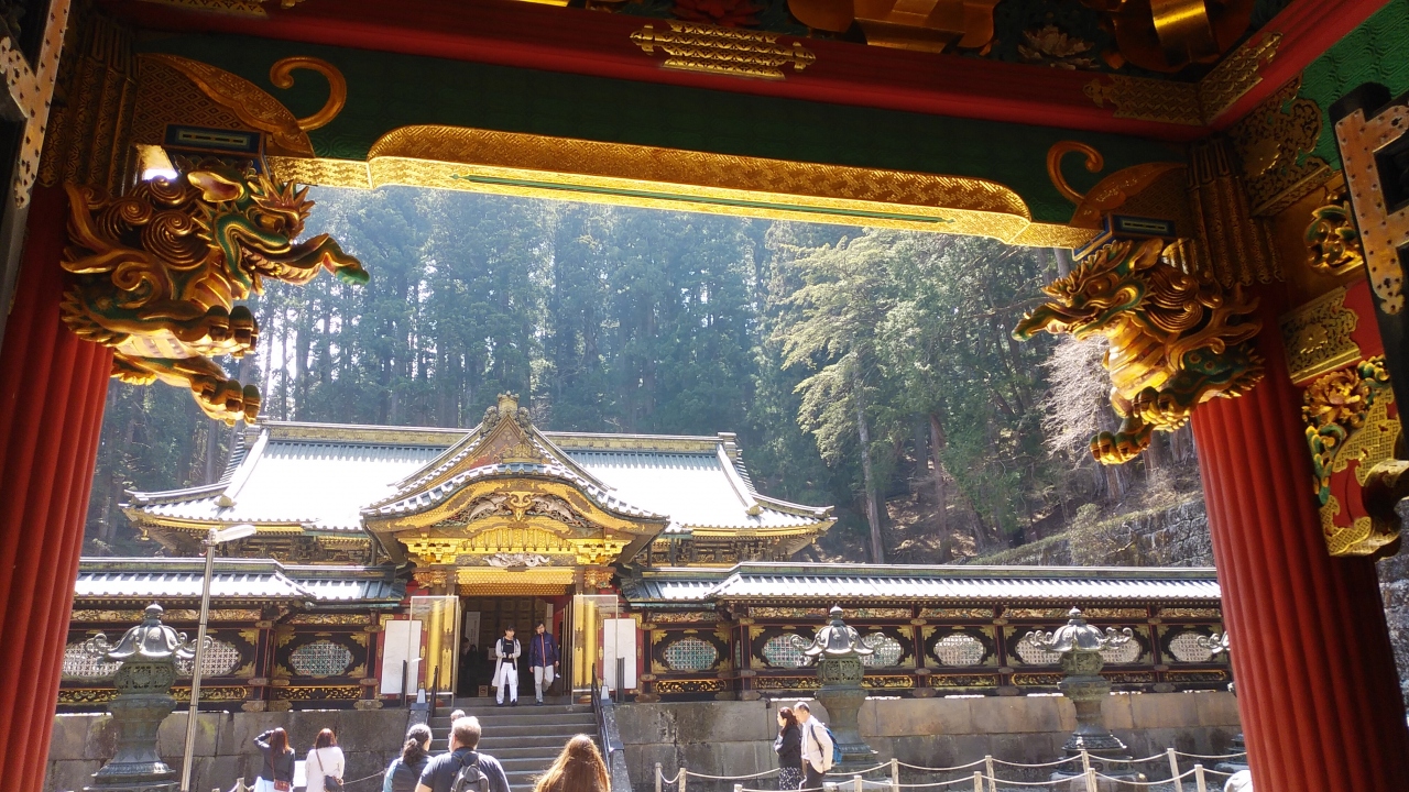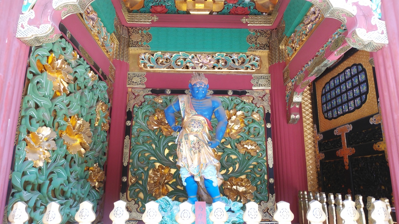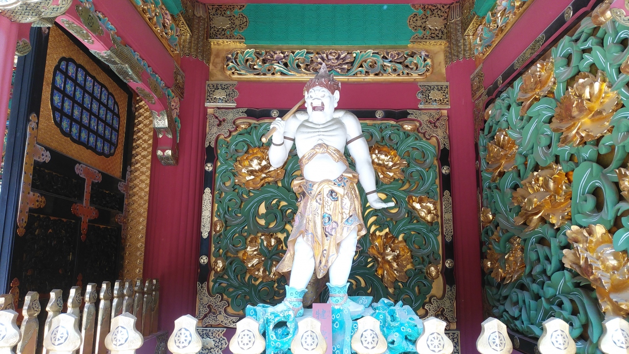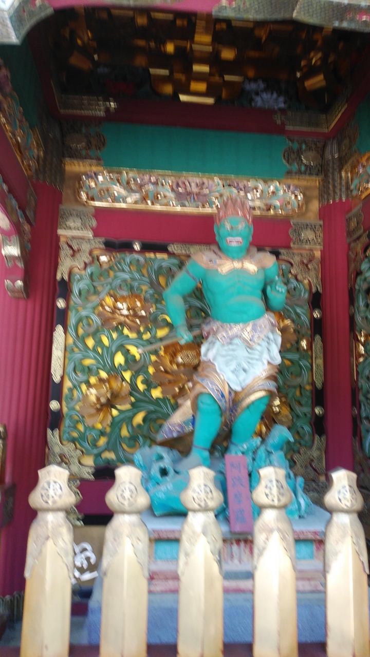 この門は、徳川家光が眠る「輪王寺・大獣院」を守護する目的で造営されたそうで、切妻造表裏軒唐破風付銅瓦葺きだそうです。別名「牡丹門」と呼ばれその所以は「牡丹の花模様」と「唐草模様の彫刻」が彫られています。この門には高野山と同じ様に表裏に2体ずつ像がありますが、四夜叉といい青面金剛に従う四護法善神の夜叉で4体の夜叉像の色彩が異なり眩しいくらいでした。表門には、「毘陀羅」といい赤色で「南方の方角を守護」し、「あばつまら」といい緑色で「北の方角を守護し」し、裏側には「鳥摩勤伽(うまろきゃ)」といい青色で「東の方角を守護」し、「鍵陀羅」といい白色で「西の方角を守護」していて、更に夜叉門を取り囲むように燈籠が荒垣内に添えられて守護していて、仁王門・二天門それぞれ趣が異なり感動しました。