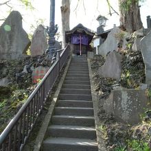 仁王門をくぐり更に上へ進んだ左手にあります。まっすぐに延びた細い階段が目につくので、すぐ分かりました。すれ違いができるだけの幅はあるので、上に人が居ても待つ必要はありませんが、お社は小さいので、手を合わせるのは順番になります。