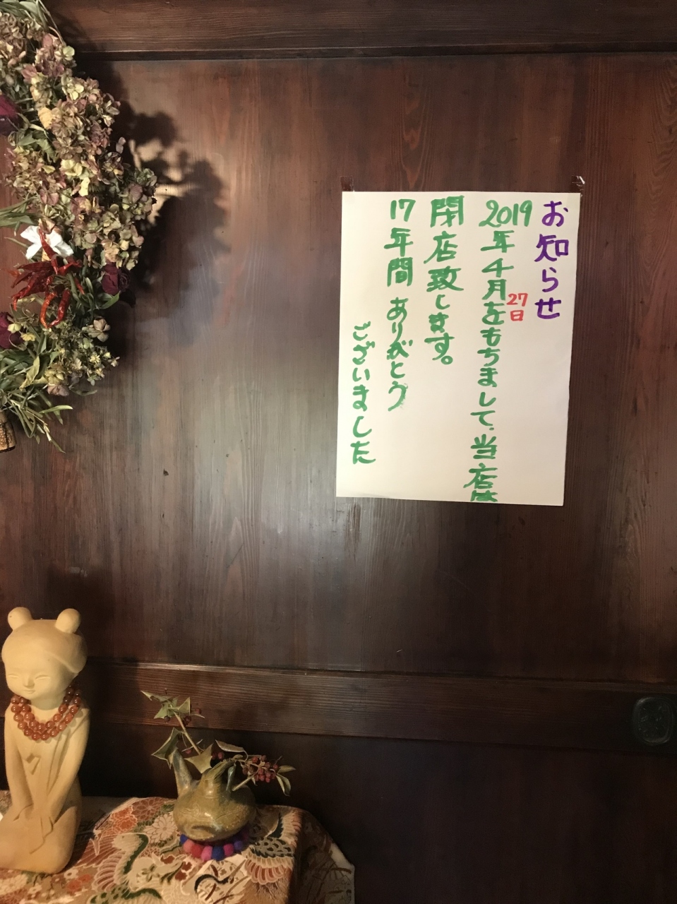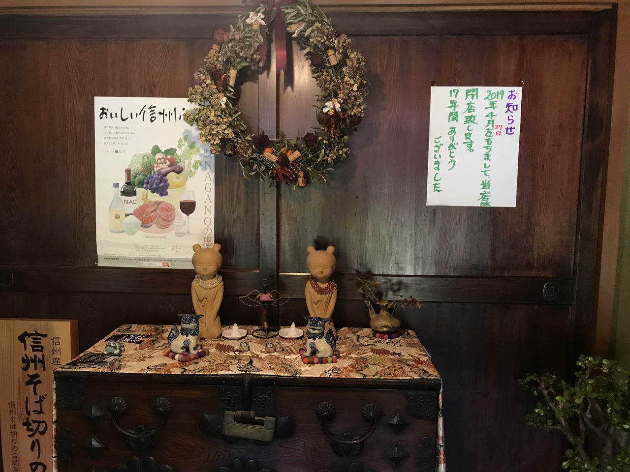 平成が終わり新元号令和を迎える10連休初日の2019年4月27日、何年かご無沙汰していた長野市の蕎麦店西屋敷で昼食をいただきました。入店すると眼に飛び込んできた手書きの貼り紙は、この日を最後に閉店することを伝えていました。お店には常連らしきお客様が次々と訪れ別れを惜しむ様子がうかがえました。6月には市内の別の場所に移転し飲食店を開業するそうですが、蕎麦のお店ではないようです