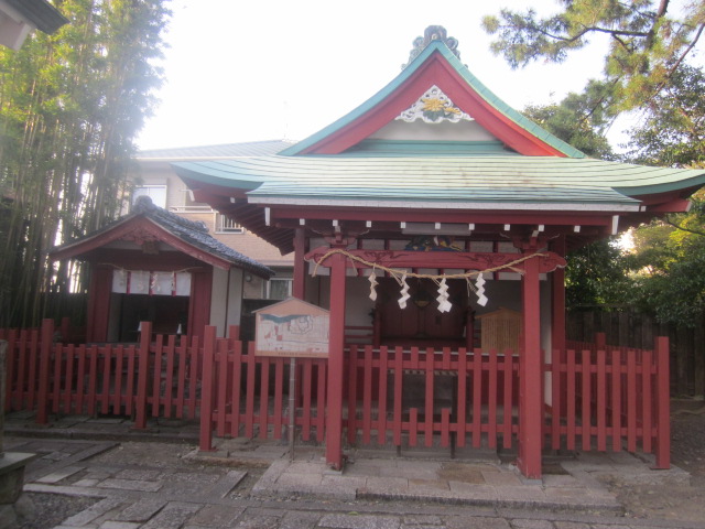 吉田神社の境内、本殿向って左側にある、朱塗りの小さな祠といった感じのスポットですが、設置された解説板などを見ていると、ここが歴史的に重要視されていた稲荷社であることが伝わってきました。普通のお稲荷さんのように朱色が目立つ風情ではなく、寧ろ、棟部分のカラフルな鶏を模したようなレリーフ装飾に、独特の味わいを感じることが出来ました。