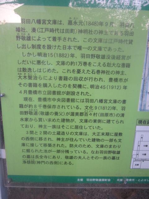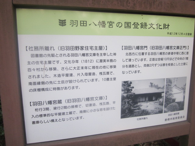 豊橋駅の北西側、立地的には線路の西側になりますので、豊橋駅の表口としての東口よりも、西口からのアクセスが便利な八幡宮です。駅からは徒歩10分程度の距離です。ここは本宮以上に、市内の図書館の魁とされる羽田八幡宮文庫関連の文化財が特に貴重で、国の登録文化財となっていますので、少し目立たない場所にありますが、ご覧になって行かれると良いです。私は春の訪問でしたが、参道入口鳥居傍の桜がとても美しかったです。