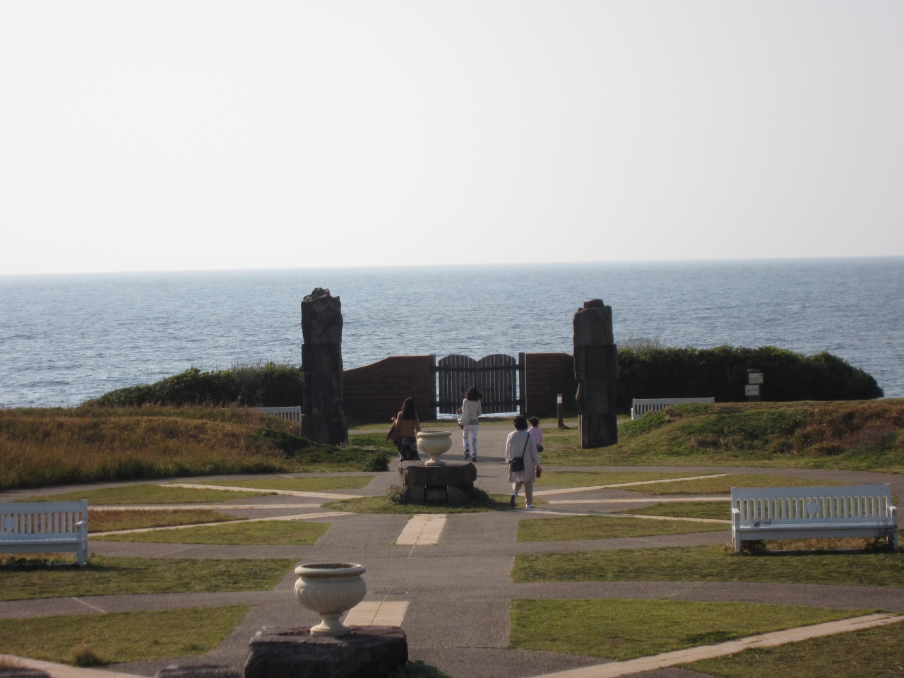 灯台から海まで公園が整備されていました。円形の石畳が2つつながってあって、中央には白い大きな壺のオブジェがあります。何となくギリシャっぽくてロマンチックな気分で散歩をしまた。白いベンチもあるので、のんびり過ごしたいカップルにお勧めの公園です。