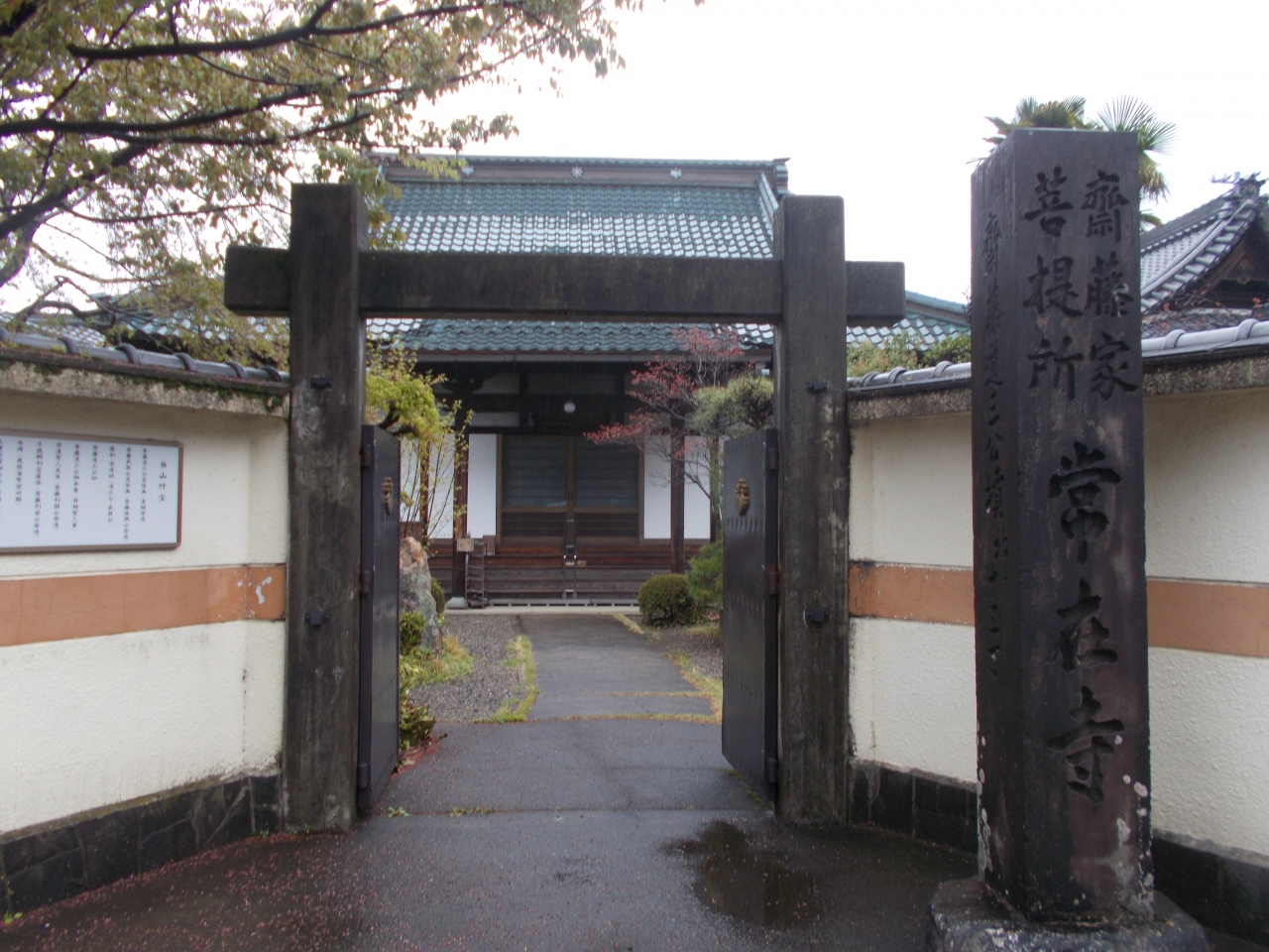 この常在寺は岐阜公園に近くにあります。岐阜の町の本町にあります。この常在寺はもとは日蓮宗京都妙覚寺の末寺です。その妙覚寺と関係があった斎藤道三の父がこの岐阜にかかわり斎藤道三と子の義龍とが美濃の国を作りました。今はその親子の像が安置されています。本堂前の境内は石と木を組み合わせた日本庭園のようです。また本堂の屋根の左右に広がった美しい姿です。