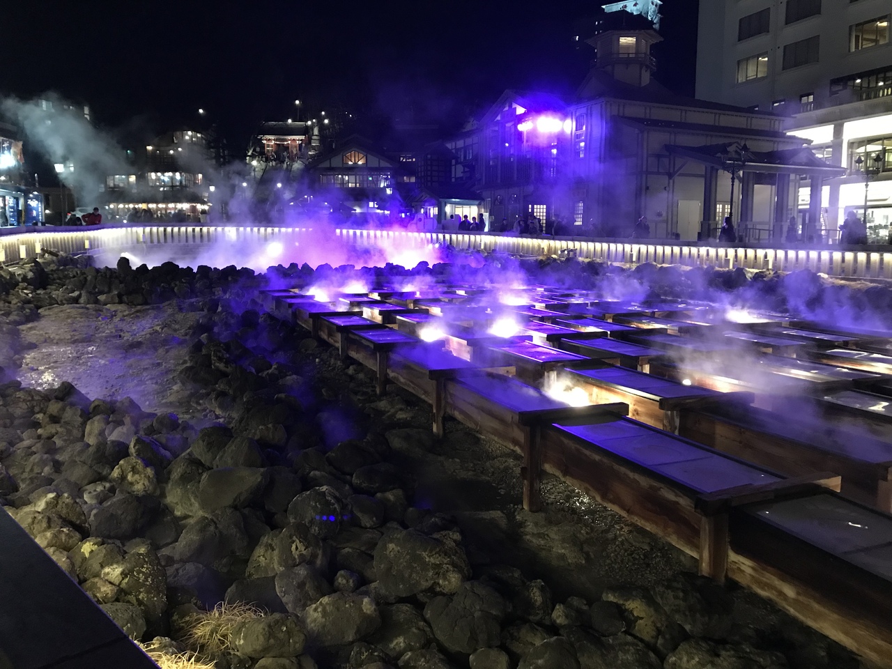 草津温泉:湯畑イルミネーション、湯けむりにより変わる