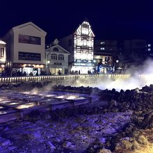 風向きにより、湯けむりにライトが当たら無い時は、ライトは普通の暗闇の中の街灯の灯りだった。