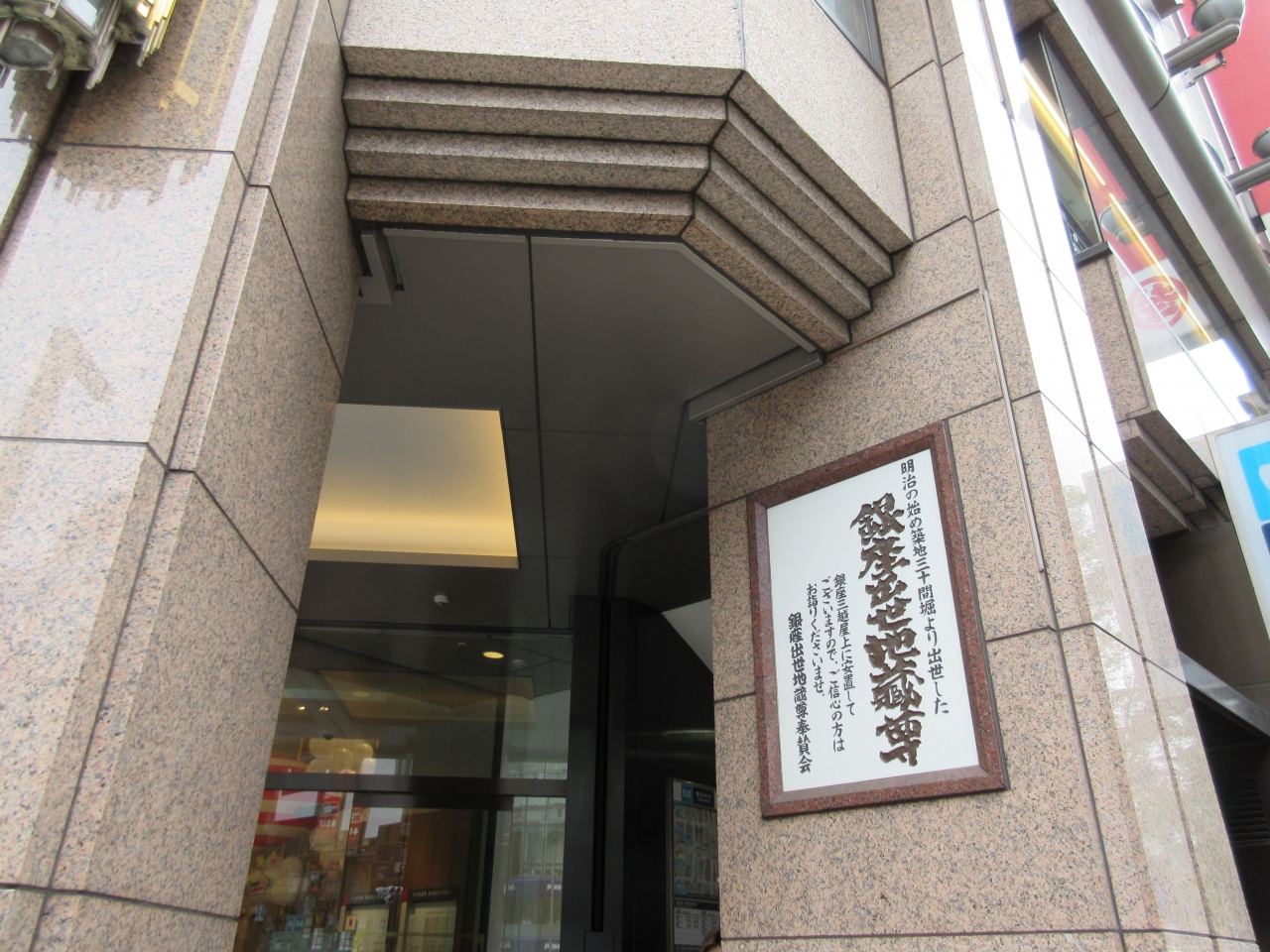 銀座4丁目角のランドマーク三越銀座店の正面入り口側に。「銀座出世地蔵尊」の表記板があります。地蔵尊は屋上の六角堂に安置されています。三十間堀の護岸工事中にお地蔵様が見つかり、路上に祀られていたのが、1968年の三越改装の際に屋上に移転したそうです。中央区の区民有形民俗文化財に登録されています。