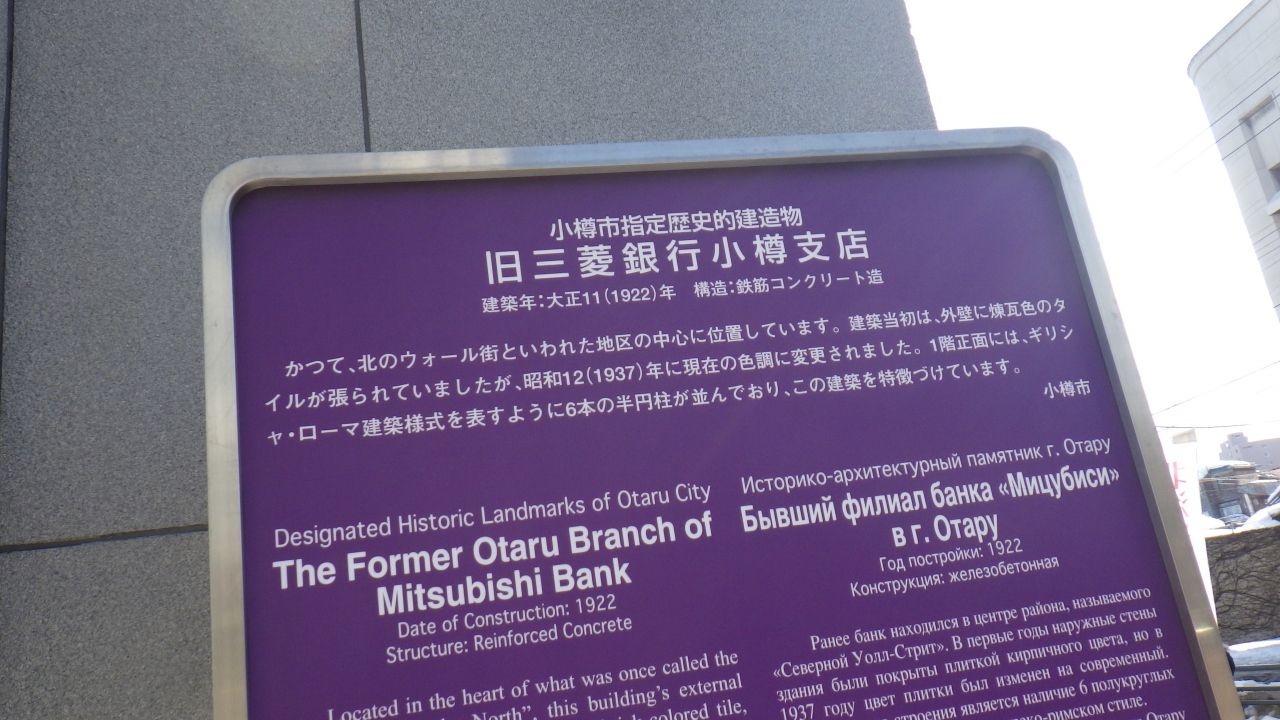 正面にギリシャ、ローマ建築様式の6本の半円柱が並んでますが、煉瓦タイル張りが想像つかないので見てみたいものです。現在は北海道中央バス色内営業所と使われていて観光客と市民の足としてバスターミナルとして使われています。