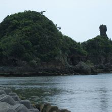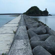 島とは防波堤で繋がっており、近くまで行けますが、対岸にある“ふれあい公園”の駐車場から島の全景が見られます。