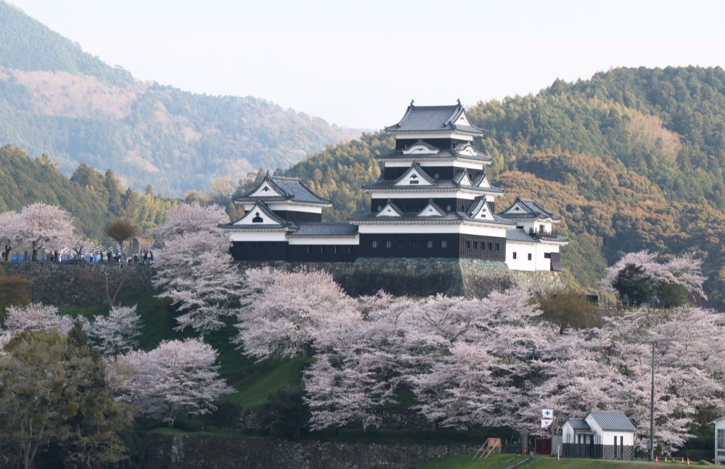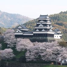 駅から約1800メートルで行けるこじんまりとした、きれいに再建されたお城です。桜のシーズンは城山全体が桜に埋もれて遠くからも写真に撮れる被写体です。一番の絶景スポットは行く途中の川にかかる橋の上からと、八幡浜へ行くJRが渡る鉄橋の上からです。その両方から写真を撮りました。